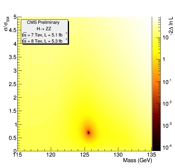 To make more visible the structure in the lower part of the color map, we go into logarithmic scale along the Z axis. This works very well and we can clearly see the spot at 125 GeV.