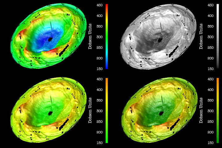 Figure 3: Four different colormaps are explored in this figure showing ozone levels in the southern hemisphere. The top-left panel shows the rainbow colormap. The top-right panel demonstrates how well a luminance-based colormap represents high-spatial-frequency (detailed) information. The bottom-left panel demonstrates how well a saturation-based colormap reveals low-spatial-frequency information. Combining luminance and saturation produces colormap that communicates both low and high-spatial frequency information, and may be a good candidate for a new default colormap. Source: Rogowitz, B.E. and Treinish, L.A., “Data Visualization: The End of the Rainbow” IEEE Spectrum 35, Issue 12, pp. 52-59, 1998.