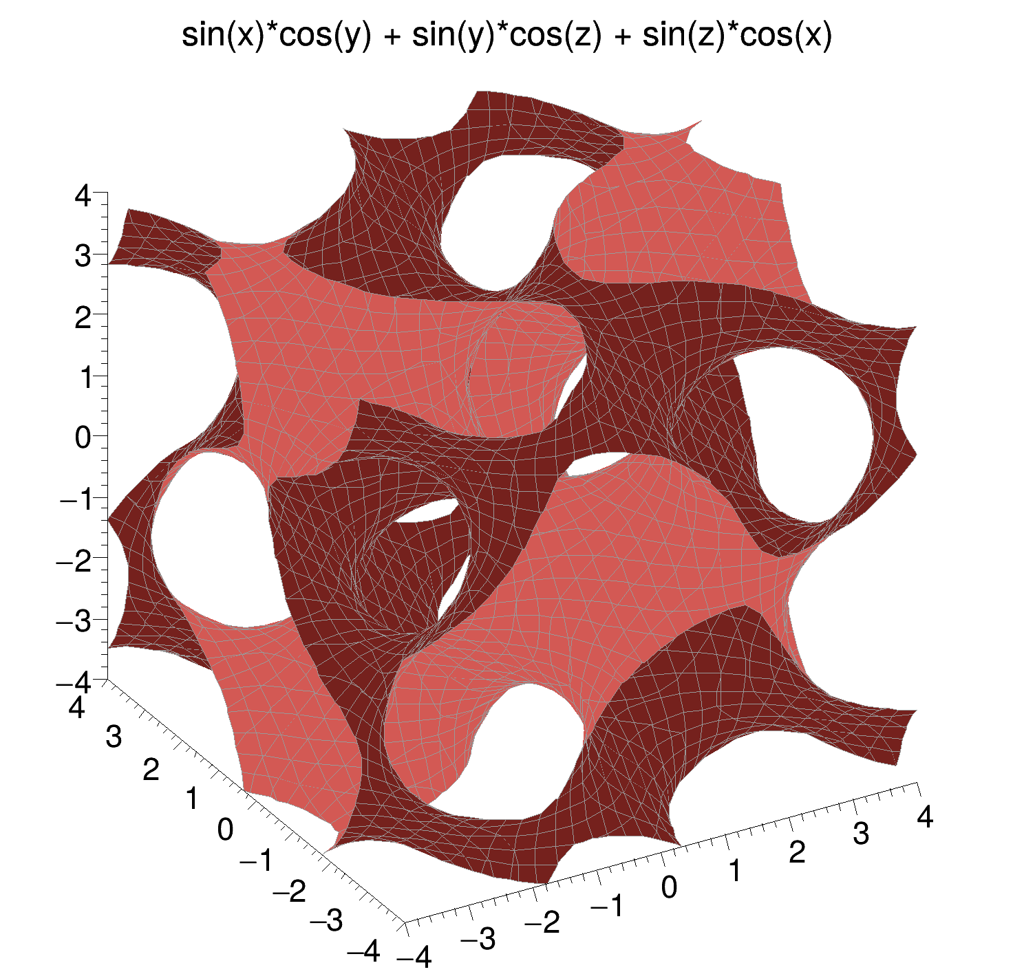 3D implicit functions can be visualized as iso-surfaces. An implicit surface is defined by the equation f(x,y,z) = 0 and is rendered in Cartesian coordinates.