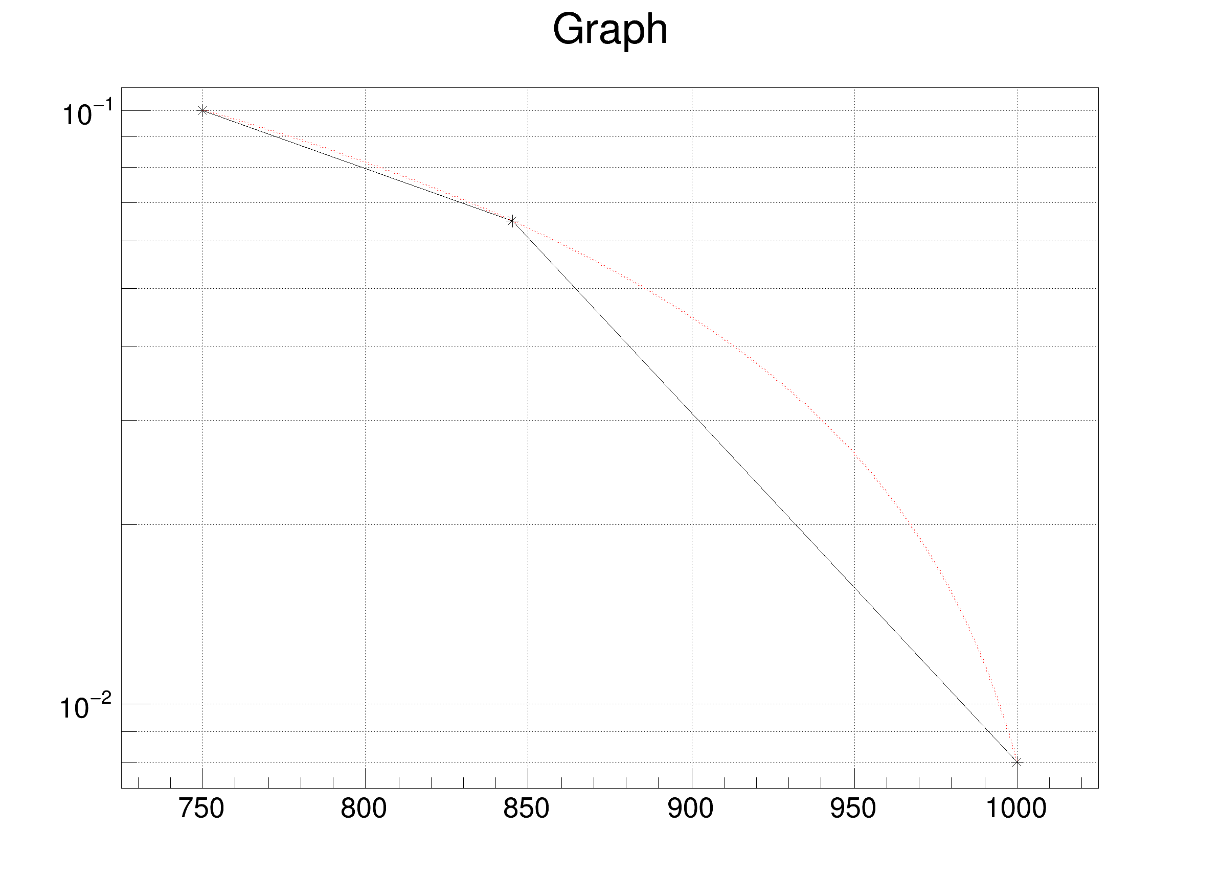 Like histograms, graphs can be drawn in logarithmic scale along X and Y. When a pad is set to logarithmic scale with TPad::SetLogx() and/or with TPad::SetLogy() the points building the graph are converted into logarithmic scale. But only the points not the lines connecting them which stay linear. This can be clearly seen on the following example: