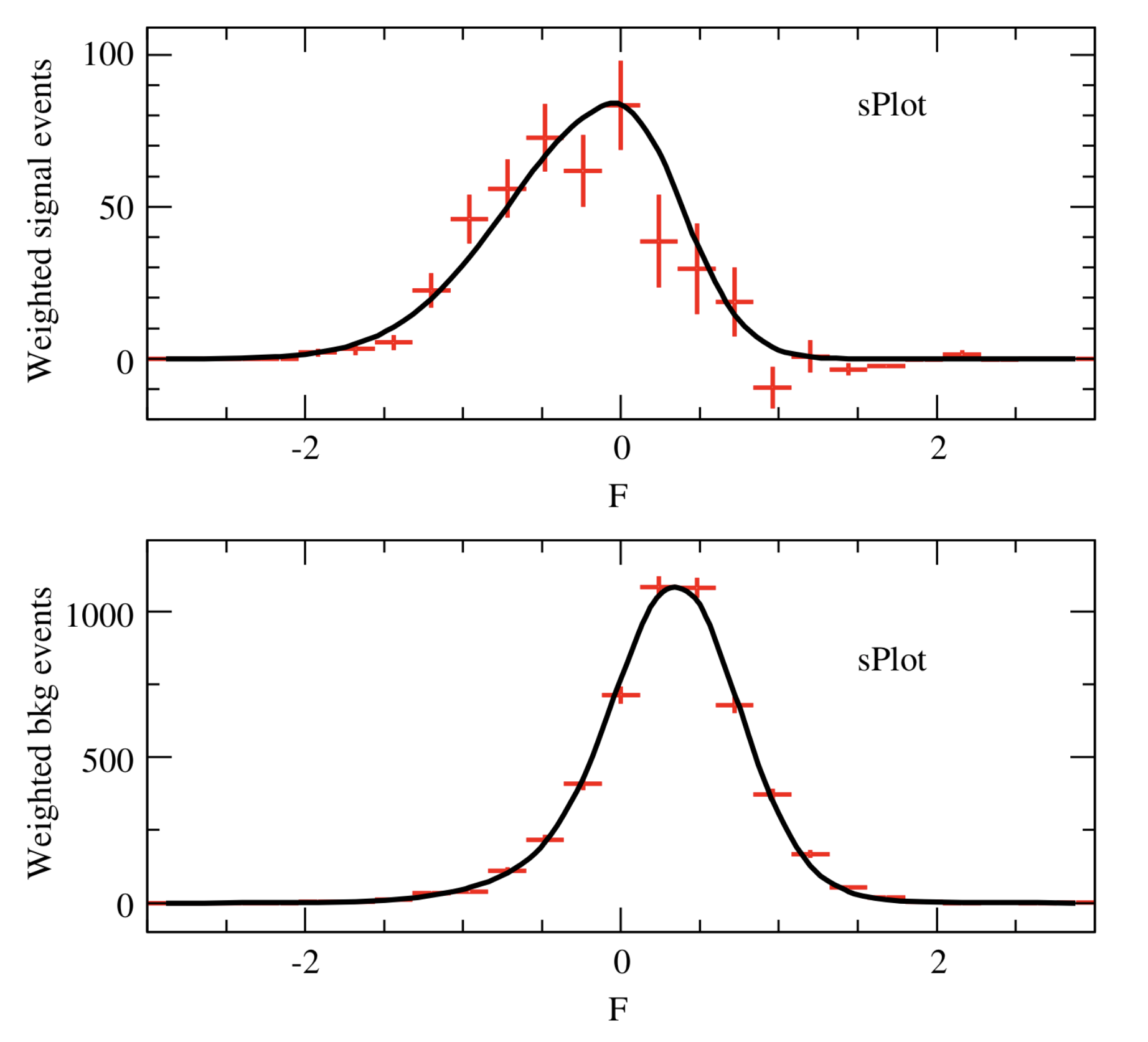 Choosing \(\Delta E\) and \({\cal F}\) as discriminating variables to determine \(N_1\) and \(N_2\) through a maximum Likelihood fit, one builds, for the control variable \({m_{\rm ES}}\) which is unknown to the fit, the two \(\hbox {$_s$}{\cal P}lots\) for signal and background shown in Fig. 3. One observes that the \(\hbox{$_s$}{\cal P}lot\) for signal reproduces correctly the PDF even where the latter vanishes, although the error bars remain sizeable. This results from the almost complete cancellation between positive and negative weights: the sum of weights is close to zero while the sum of weights squared is not. The occurence of negative weights occurs through the appearance of the covariance matrix, and its negative components, in the definition of Eq. (2).