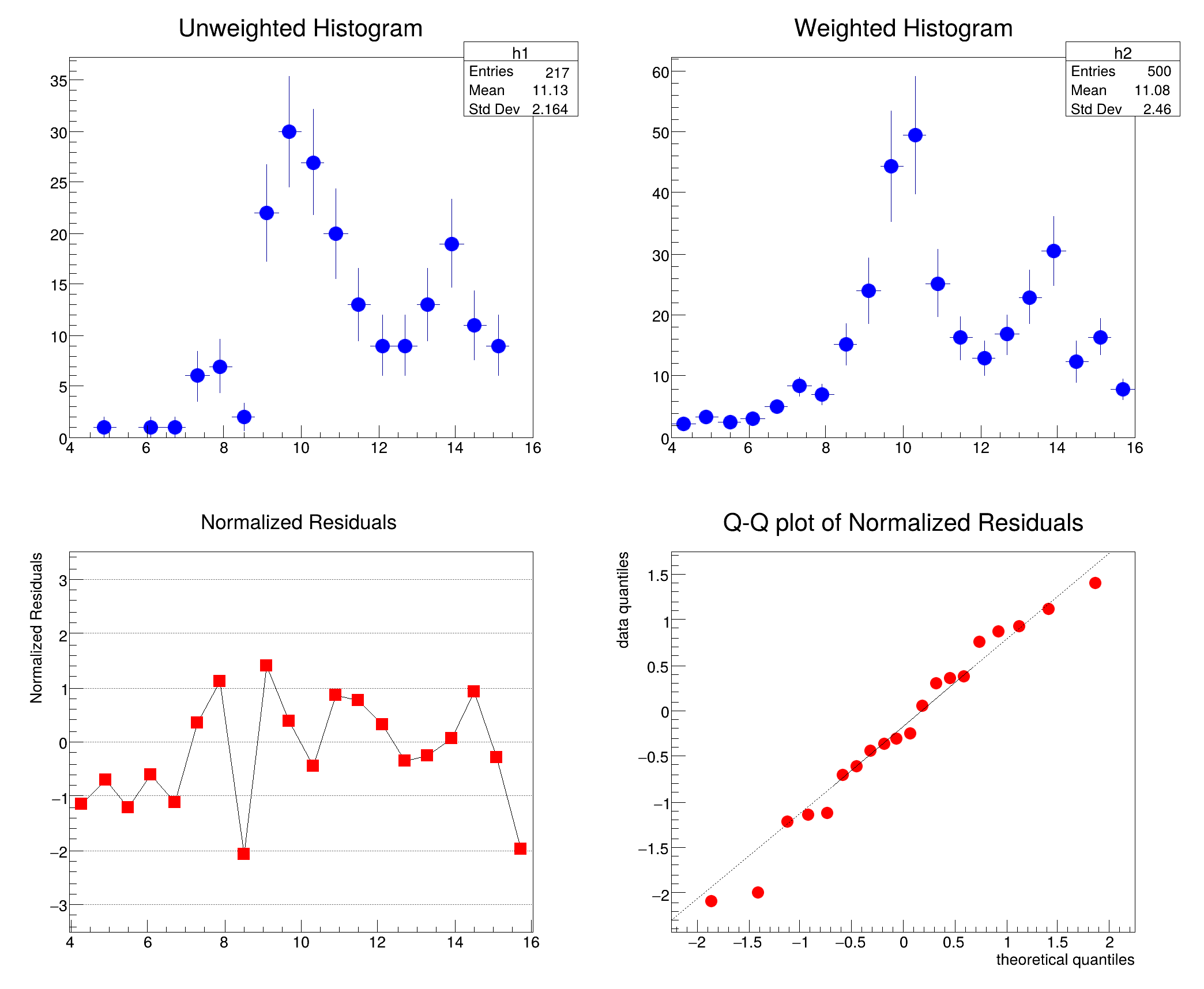One unweighted histogram is compared with a weighted histogram. The normalized residuals are retrieved and plotted in a simple graph. The QQ plot of the normalized residual using the normal distribution is also plotted.