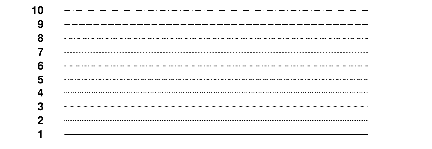 The line width is expressed in pixel units. The line width of any class inheriting from TAttLine can be changed using the method SetLineWidth and retrieved using the method GetLineWidth. The following picture shows the line widths from 1 to 10 pixels.