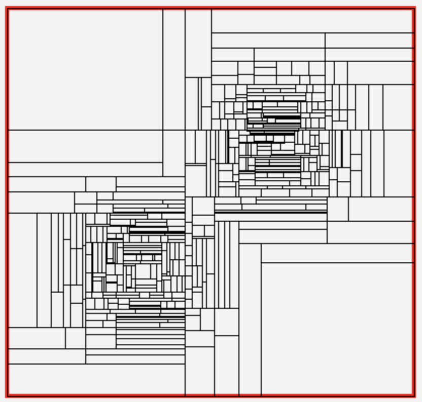 FOAM is the simplified version of the multi-dimensional general purpose Monte Carlo event generator (integrator) FOAM. It creates hyper-rectangular "foam of cells", which is more dense around its peaks. See the following 2-dim. example of the map of 1000 cells for doubly peaked distribution: