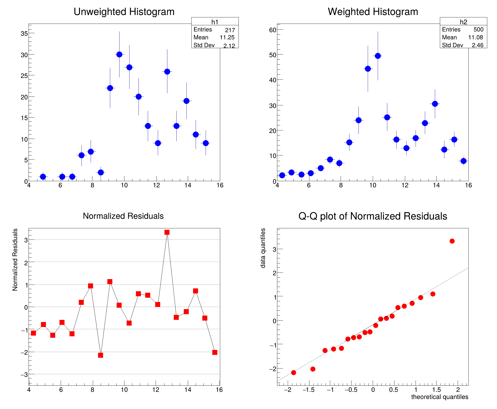 One-dimensional histograms can be fit in Python with a similar syntax as in C++. To fit a 1D histogram to one of the ROOT standard functions (e.g. a Gaussian): The list of standard functions in ROOT can be accessed with the TROOT::GetListOfFunctions. In Python, the standard functions for TF1 can be printed as follows: To access the results of the fit, run the TH1::Fit method with the "s" option (please see the TH1::Fit(TF1*, Option_t*, Option_t*, Double_t, Double_t) documentation for a list of possible options). This will return a TFitResult which can be examined with the corresponding TFitResult methods, with the same names in Python as in C++. For example: 1D histograms can also be fit to any user-defined function expressed as a TF1 (see the TF1 documentation for examples on how to do this). For example, a TF1 can be defined and initialized with its ROOT constructor: A TF1 can also be defined using a Python function, for example: The TH1 class has several additions for its use from Python, which are also available in its subclasses (e.g., TH1F, TH1D). TH1 instances support in-place multiplication with a scalar value using the This operation is equivalent to calling The Fill method has been pythonized to accept NumPy arrays as input. This allows for efficient filling of histograms with large datasets: The Fill method accepts the following arguments when used with NumPy arrays: Please note that when providing weights, the length of the weights array must match the length of the data array. If weights are not provided, all entries will have a weight of 1. A ValueError will be raised if the lengths don't match: The original Fill method functionality is preserved for non-NumPy arguments: Further examples can be found in the tutorials: