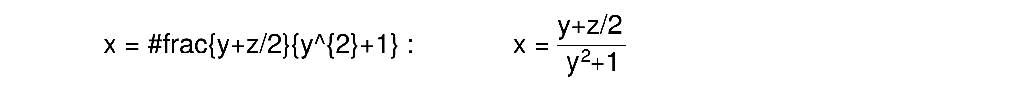 Fractions denoted by the / symbol are made in the obvious way. The #frac command is used for large fractions in displayed formula; it has two arguments: the numerator and the denominator.