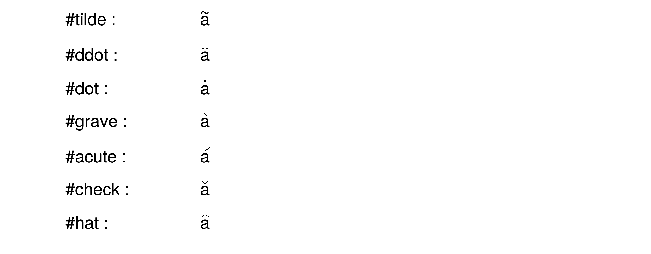 TLatex can display dozens of special mathematical symbols. A few of them, such as + and > , are produced by typing the corresponding keyboard character. Others are obtained with the commands in the following table: