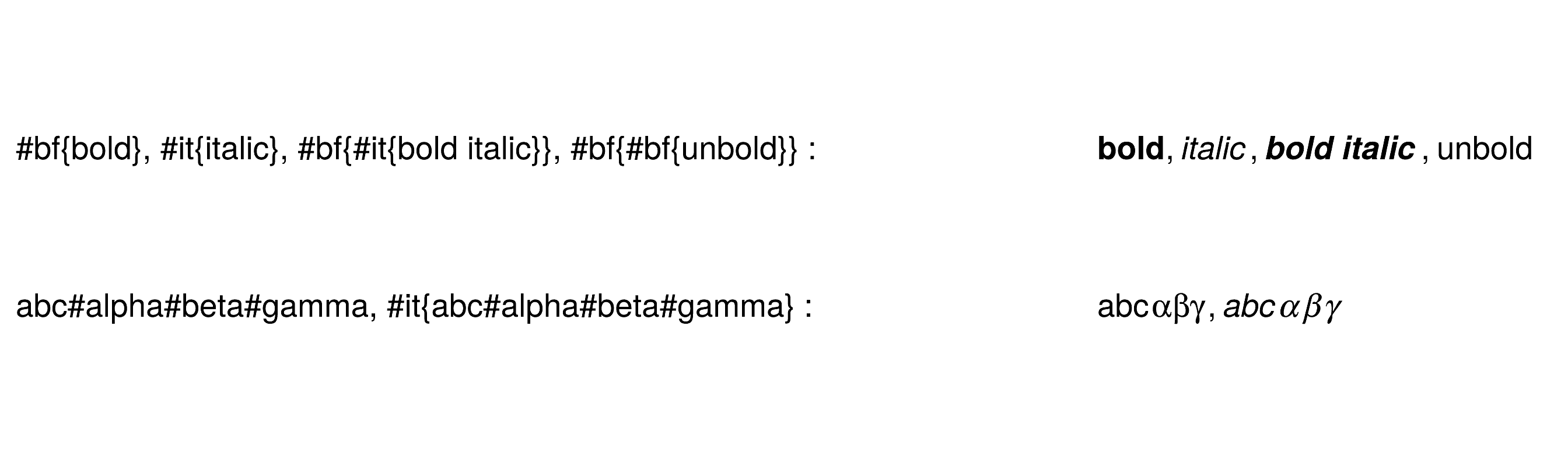 Subscripts and superscripts are made with the _ and ^ commands. These commands can be combined to make complicated subscript and superscript expressions. You may adjust the display of subscripts and superscripts by using the two functions SetIndiceSize(Double_t), which set relative size of subscripts and superscripts, and SetLimitIndiceSize(Int_t), which set limits for text resizing of subscripts and superscripts.
