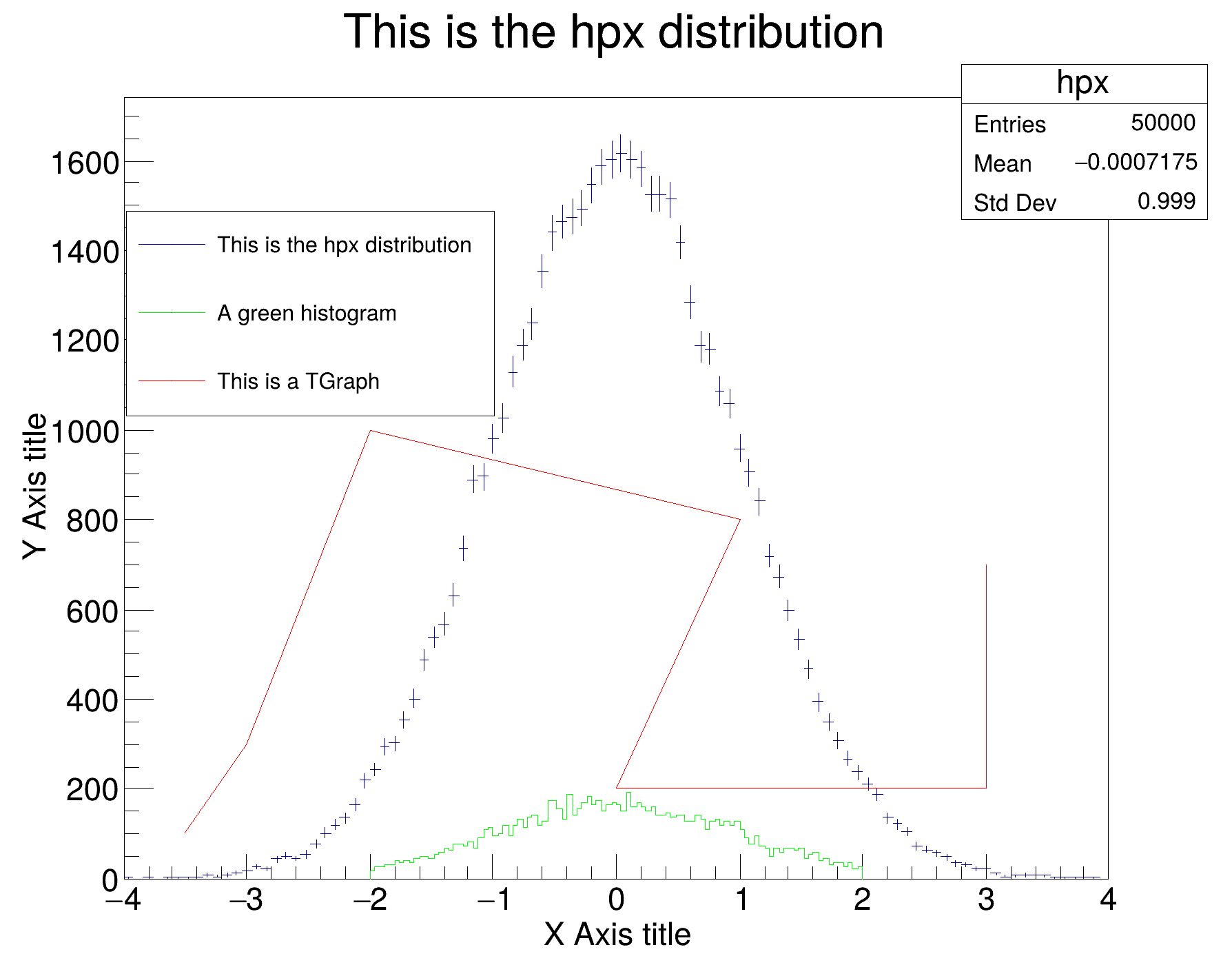 The following example shows how to create a legend. In this example the legend contains a histogram, a function and a graph. The histogram is put in the legend using its reference pointer whereas the graph and the function are added using their names. Note that, because TGraph constructors do not have the TGraph name as parameter, the graph name should be specified using the SetName method.
