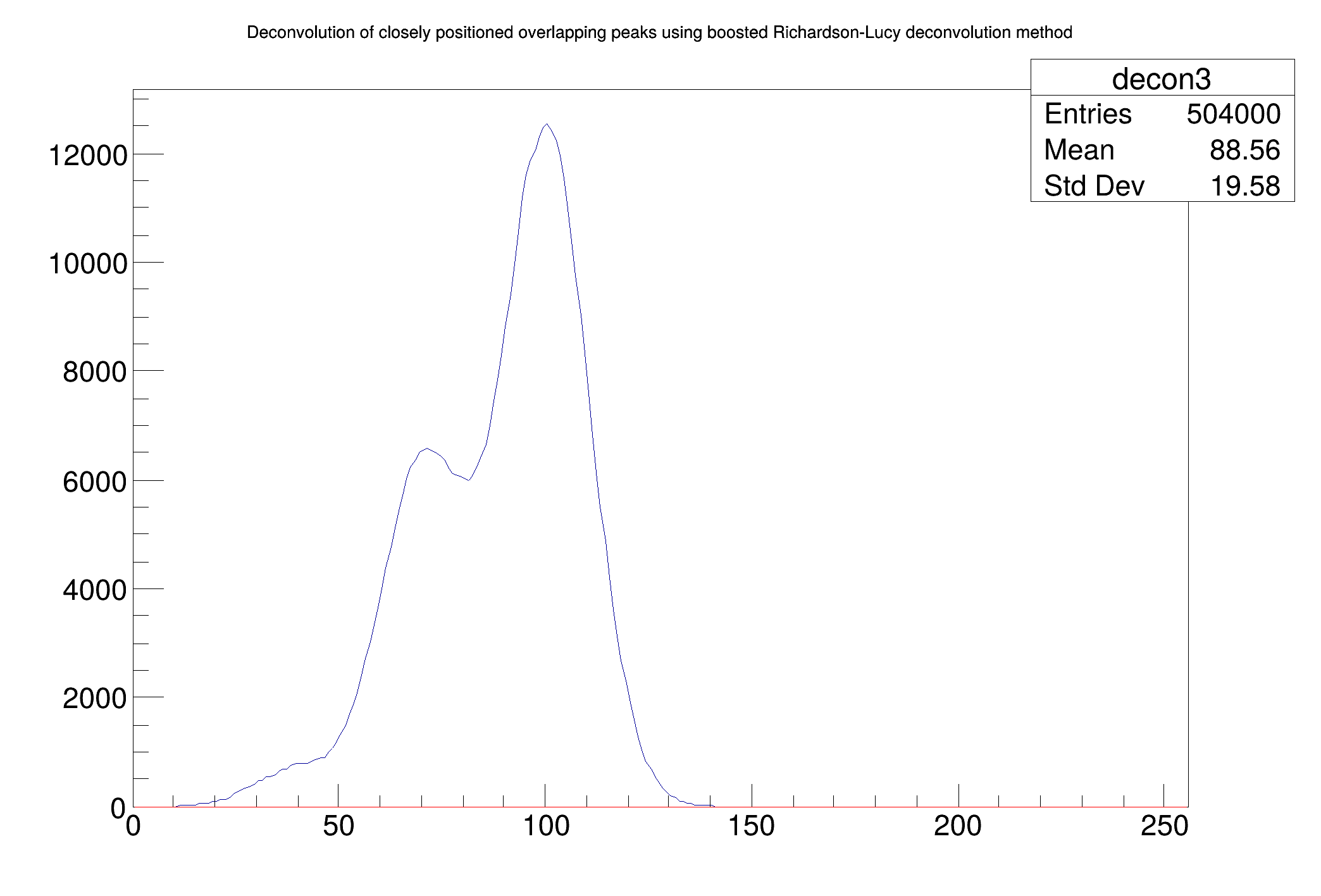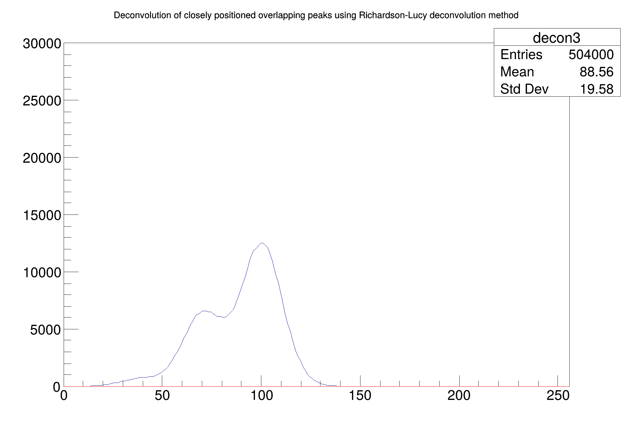 Example of Richardson-Lucy deconvolution for closely positioned wide peaks. The original source spectrum is drawn with black color, the spectrum after the deconvolution (10000 iterations) with red color.