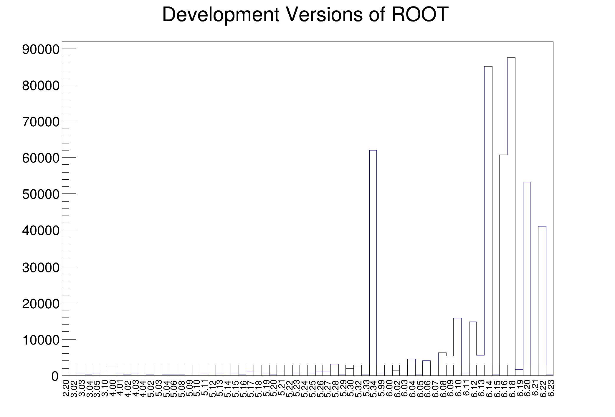 Plot the downloads of different ROOT versions reading a remote sqlite3 file with RSqliteDS. Then a TH1F histogram is created and filled using a lambda expression which receives the recorded values in the "version" column of the sqlite3 database. The histogram shows the usage of the ROOT development version.
