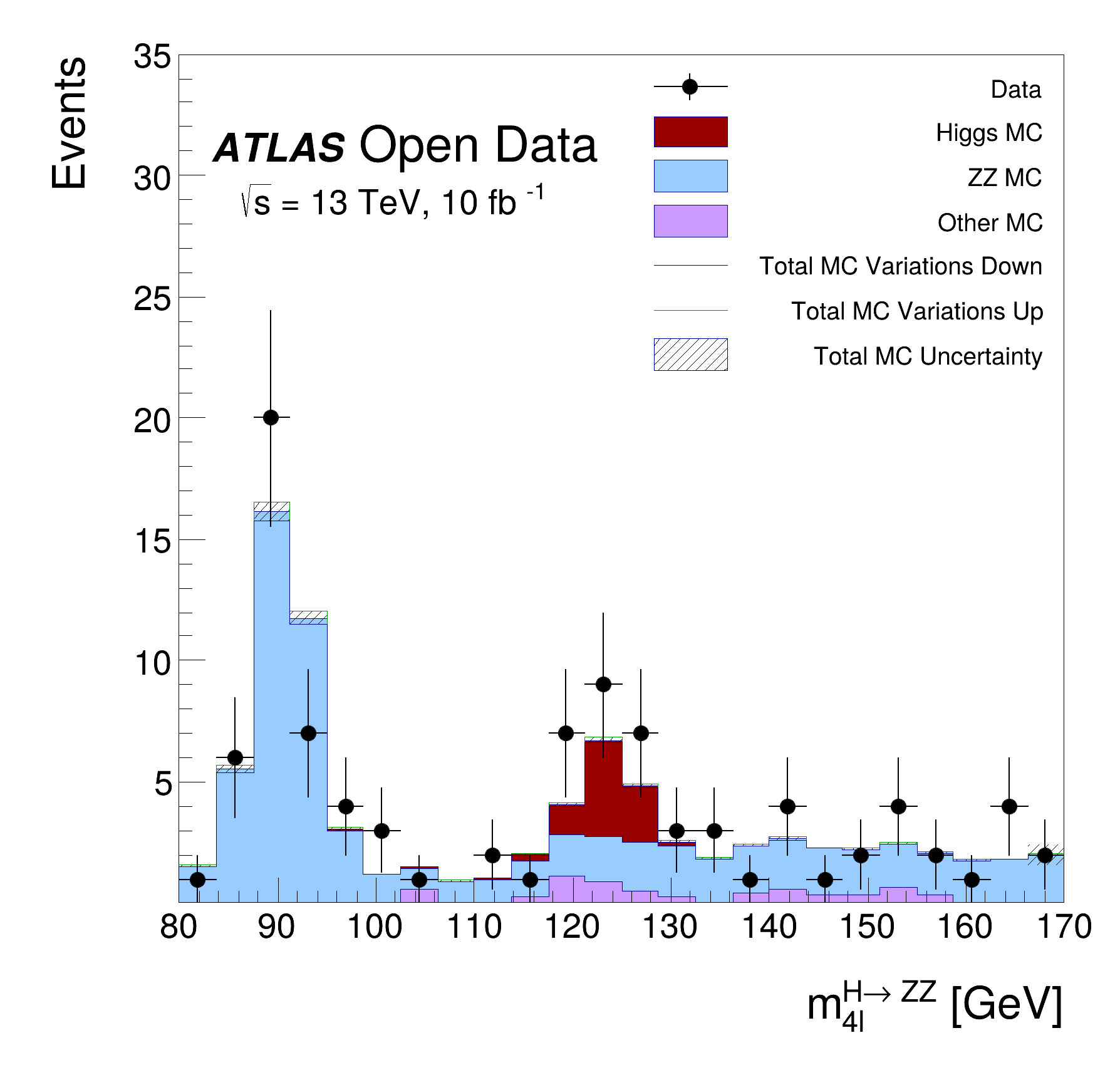 This tutorial is the Higgs to four lepton analysis from the ATLAS Open Data release in 2020 (http://opendata.atlas.cern/release/2020/documentation/). The data was taken with the ATLAS detector during 2016 at a center-of-mass energy of 13 TeV. The decay of the Standard Model Higgs boson to two Z bosons and subsequently to four leptons is called the "golden channel". The selection leads to a narrow invariant mass peak on top a relatively smooth and small background, revealing the Higgs at 125 GeV. The analysis is translated to an RDataFrame workflow processing about 300 MB of simulated events and data.