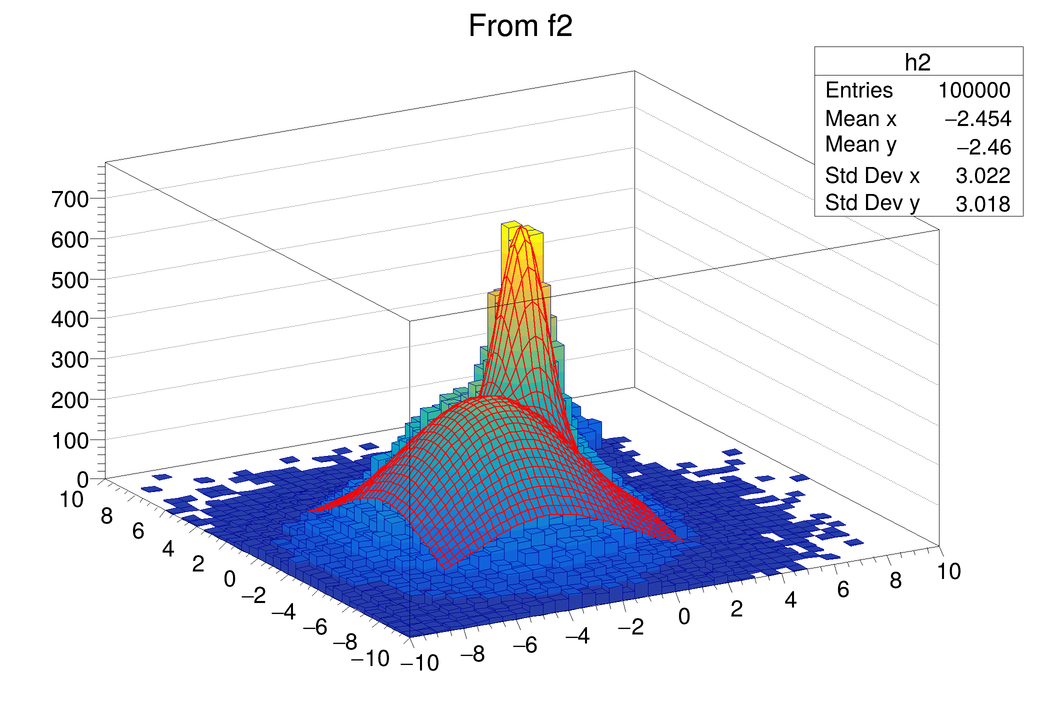 - display the fitted function on top of the histogram (lego-plot) using a surface plot in a sub-range of the histogram.
