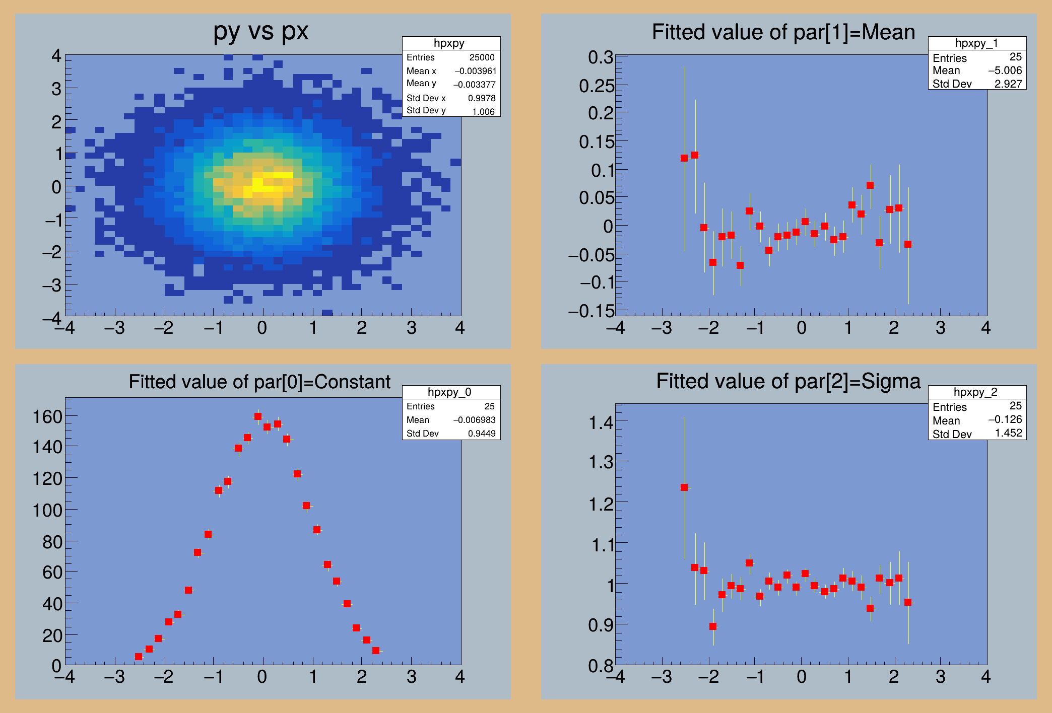 Illustrates how to use the TH1::FitSlicesY function It uses the TH2F histogram generated in macro hsimple.C It invokes FitSlicesY and draw the fitted "mean" and "sigma" in 2 sepate pads.