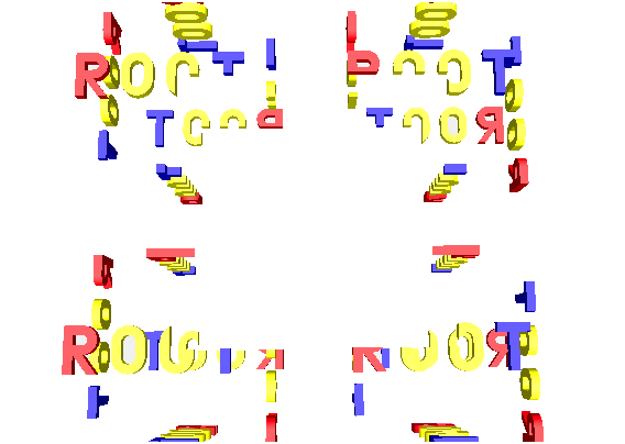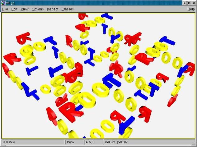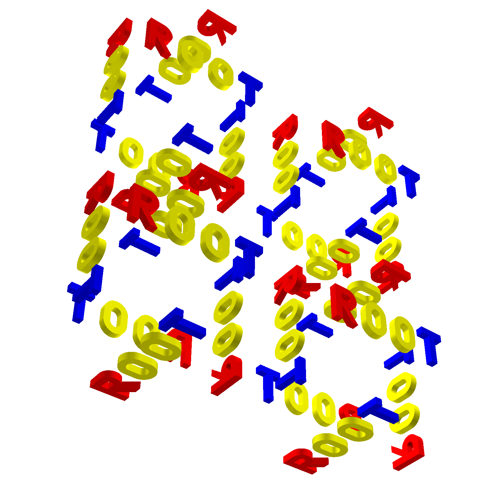 Before going further, let us get a look and feel of interacting with the modeller. For this, we will use one of the examples illustrating the geometry package. To get an idea on the geometry structure created in this example, just look at rootgeom.C. You will notice that this is a bit more complex that just creating the "world" since several other volumes are created and put together in a hierarchy. The purpose here is just to learn how to interact with a geometry that is already built, but just few hints on the building steps in this example might be useful. The geometry here represents the word ROOT that is replicated in some symmetric manner. You might for instance ask some questions after having a first look: