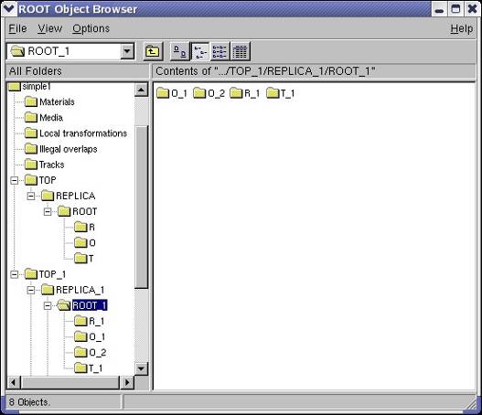 Now let us browse the hierarchy that was just created. Start a browser and double-click on the item simple1 representing the gGeoManager object. Note that right click opens the context menu of the manager class where several global methods are available.