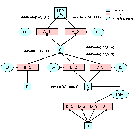 Nodes are never instantiated directly by users, but created as a result of volume operations. Adding a volume named A with a given user id inside a volume B will create a node named A_id. This will be added to the list of nodes stored by B. In addition, when applying a division operation in N slices to a volume A, a list of nodes B_1, B_2, ... , B_N is also created. A node B_i does not represent a unique object in the geometry because its container A might be at its turn positioned as node inside several other volumes. Only when a complete branch of nodes is fully defined up to the top node in the geometry, a given path:/TOP_1/.../A_3/B_7 will represent a unique object. Its global transformation matrix can be computed as the pile-up of all local transformations in its branch. We will therefore call logical graph the hierarchy defined by nodes and volumes. The expansion of the logical graph by all possible paths defines a tree structure where all nodes are unique "touchable" objects. We will call this the "physical tree". Unlike the logical graph, the physical tree can become a huge structure with several millions of nodes in case of complex geometries; therefore, it is not always a good idea to keep it transient in memory. Since the logical and physical structures are correlated, the modeller rather keeps track only of the current branch, updating the current global matrix at each change of the level in geometry. The current physical node is not an object that can be asked for at a given moment, but rather represented by the combination: current node/current global matrix. However, physical nodes have unique ID's that can be retrieved for a given modeller state. These can be fed back to the modeller in order to force a physical node to become current. The advantage of this comes from the fact that all navigation queries check first the current node; therefore the location of a point in the geometry can be saved as a starting state for later use.