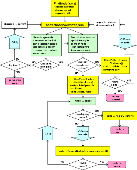 Note that the current particle position can be set using SetCurrentPosition(x,y,z) method of the manager class, in which case FindNode() can be called without arguments. The method returns a pointer to the "deepest node" that geometrically contains P (in our case let us suppose it is B\_3). Since a node is just a positioned volume, we can then get a pointer to the volume, medium or material objects related to it. "Deepest" means that B\_3 still contains point P (as well as A\_1 and TOP\_1), but none of the daughters of volume B does. After finding out the node containing the particle, one can check if the geometry state is different compared to the last located point: