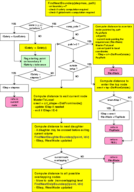 The algorithm checks first if the computation of safety was required. If this is the case and the global point coordinates did not change from the last query, the last computed safety is taken. Otherwise, the method TGeoManager::Safety () is invoked. A safety value less than TGeoShape::Tolerance() will set the flag IsOnBoundary to true. On the other hand, a safety value bigger than the proposed step will stop the computation of the distance to next boundary, returning the current geometry location with the meaning that the proposed step is safe.
