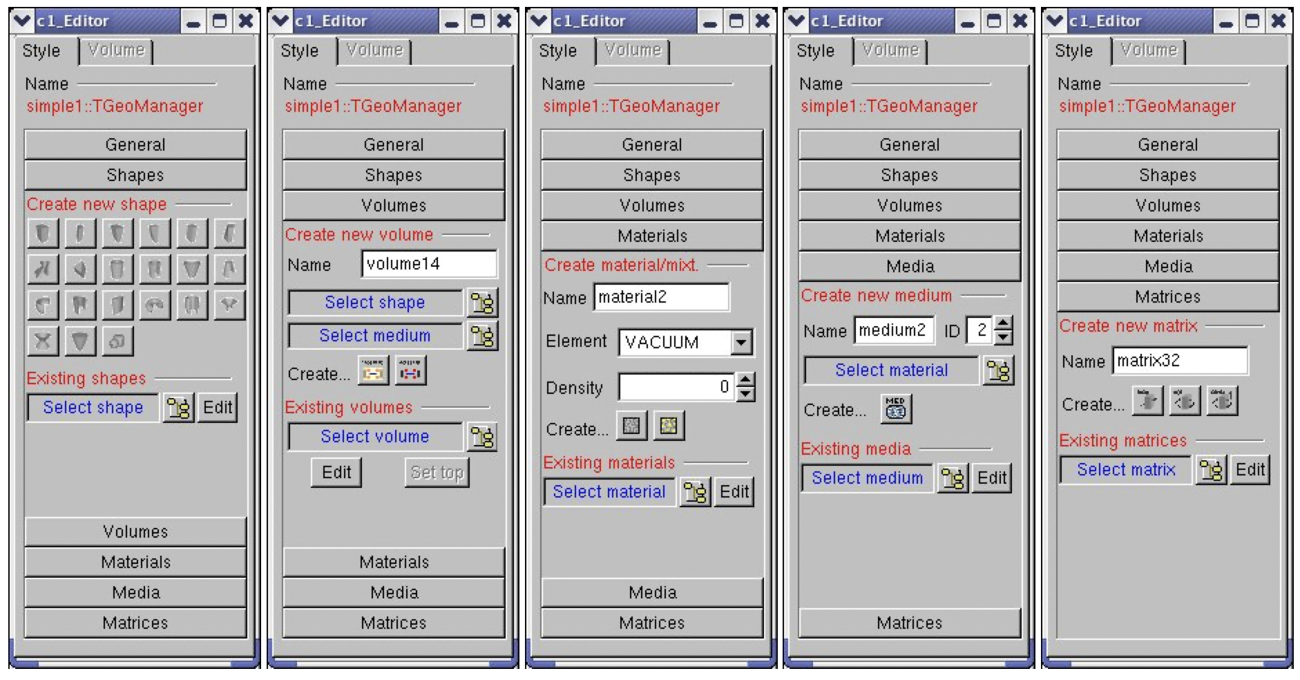 As mentioned before, volumes are the basic objects used in building the geometrical hierarchy. They represent objects that are not positioned, but store all information about the placement of the other volumes they may contain. Therefore a volume can be replicated several times in the geometry. As it was explained, in order to create a volume, one has to put together a shape and a medium, which are already defined.