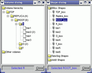 geometry_name.C or .root depending if the geometry need to be saved as a C macro or a .root file.For editing an existing object from one of the categories described above, the interface imposes first a selection among all objects of the corresponding type stored in the geometry. This can be done by clicking the button next to the blue label Select <object>. The dialog interfaces are generally different for different types of objects. The volume selection dialog offers the possibility to select either a volume already connected to the geometry hierarchy or non-connected ones. Selection for shapes and matrices is split into categories represented by top-level list tree items for: boxes, tubes, translations, rotations, etc.
