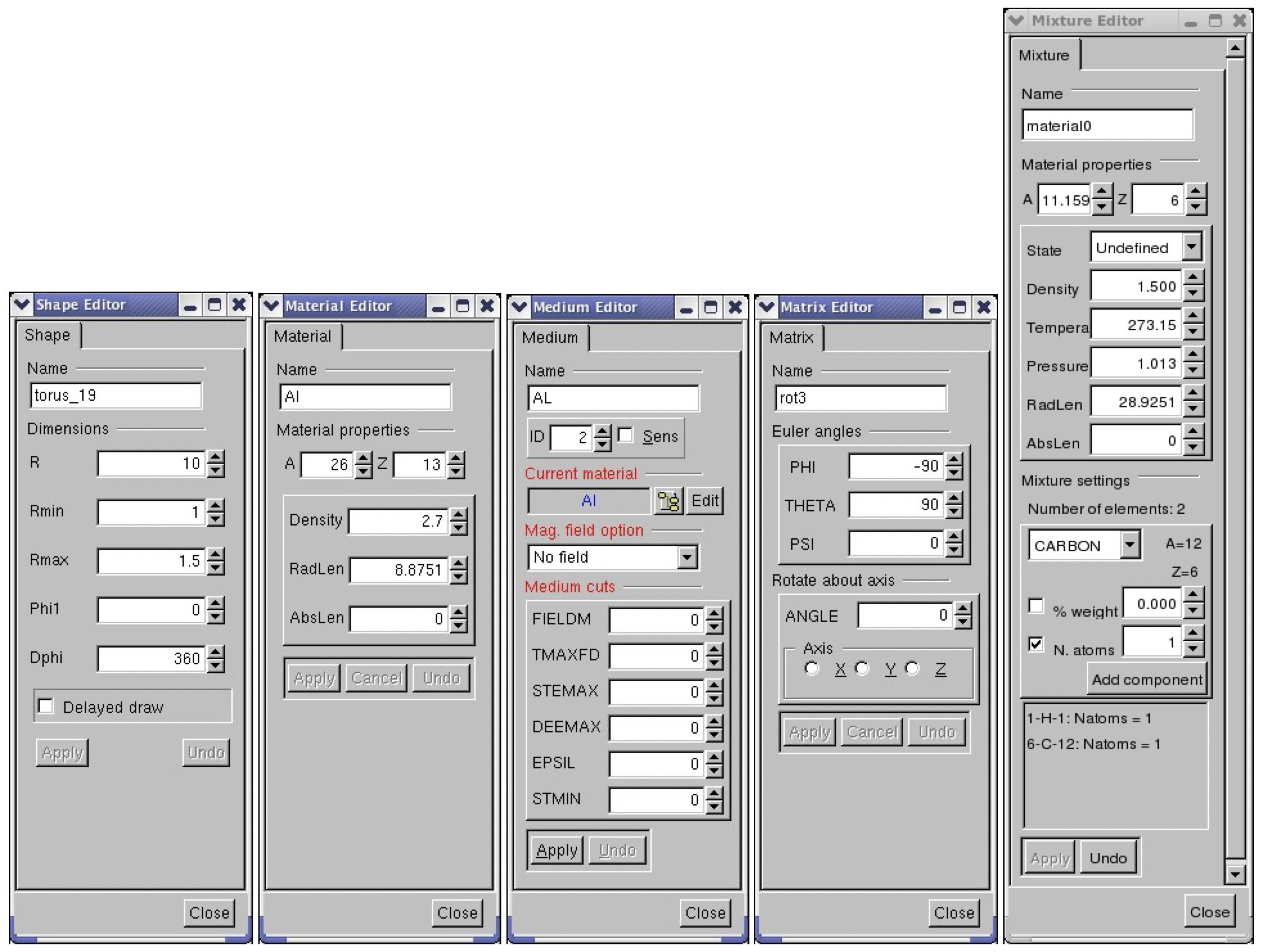 All material properties changes are undoable. The mixture editor currently allows adding elements one by one in the mixture composition. This can be done either by element weight fraction or by number of atoms. Once an element was added using one method the other method is not selectable anymore. Summing component fractions up to 1 in the final mixture is the user responsibility. Adding materials as components of a mixture is not supported in this version.