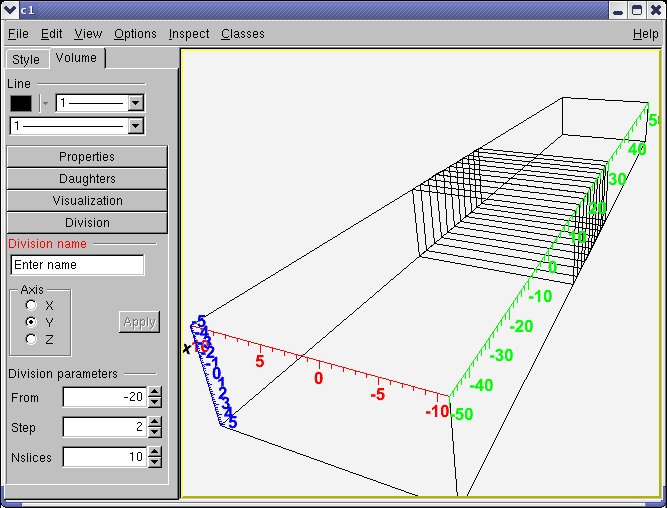A check is always done on the resulting division range: if not fitting into the container limits, an error message is posted. If we will browse the divided volume we will notice that it will contain N nodes starting with index 1 up to N. The first one has the lower X limit at START position, while the last one will have the upper X limit at START+N*STEP. The resulting slices cannot be positioned inside another volume (they are by default positioned inside the divided one) but can be further divided and may contain other volumes: