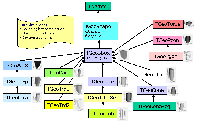 The "shapes" provide the definition of the local coordinate system of the volume. Any volume must have a shape. Any shape recognized by the modeller has to derive from the base **TGeoShape** class, providing methods for:
