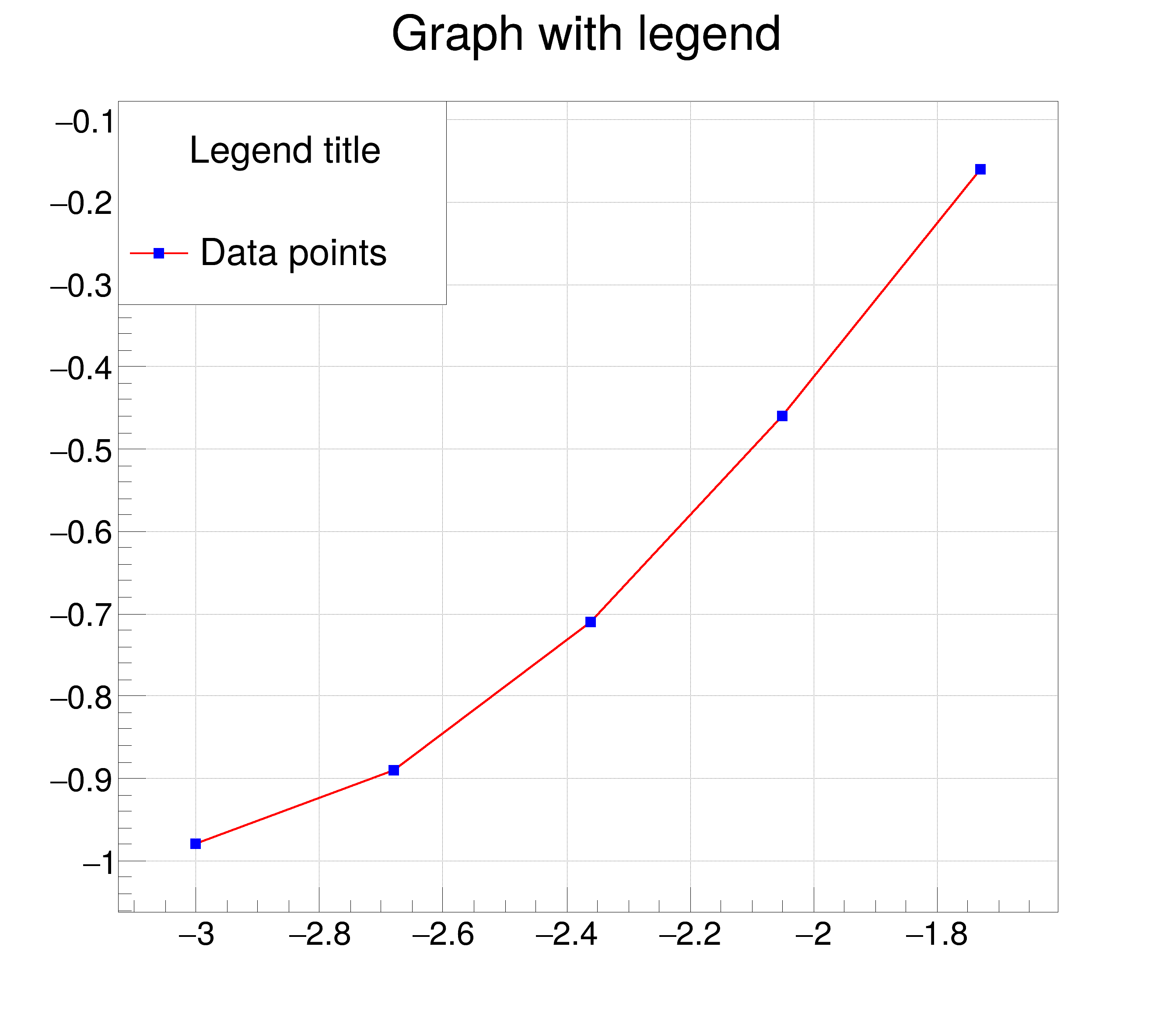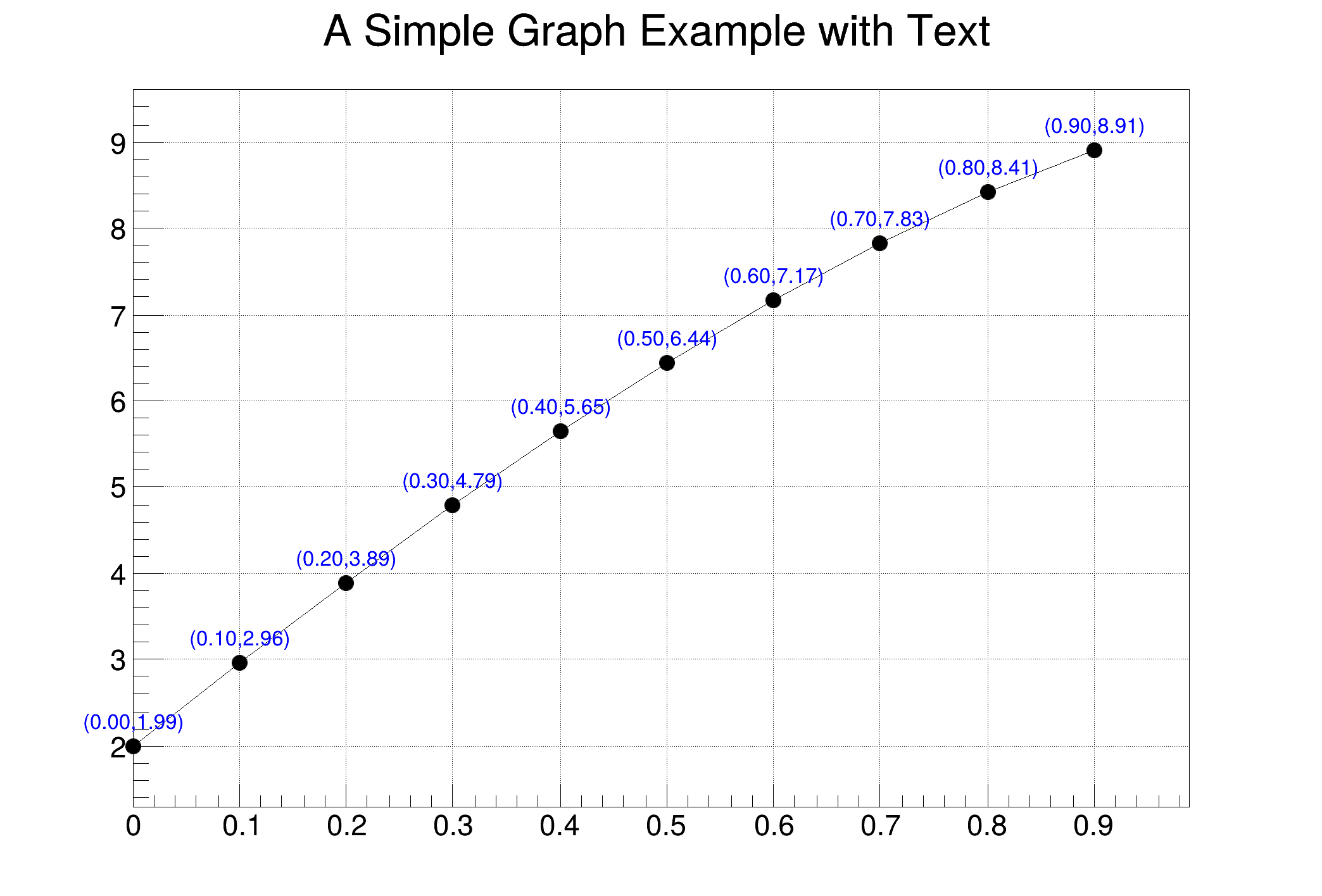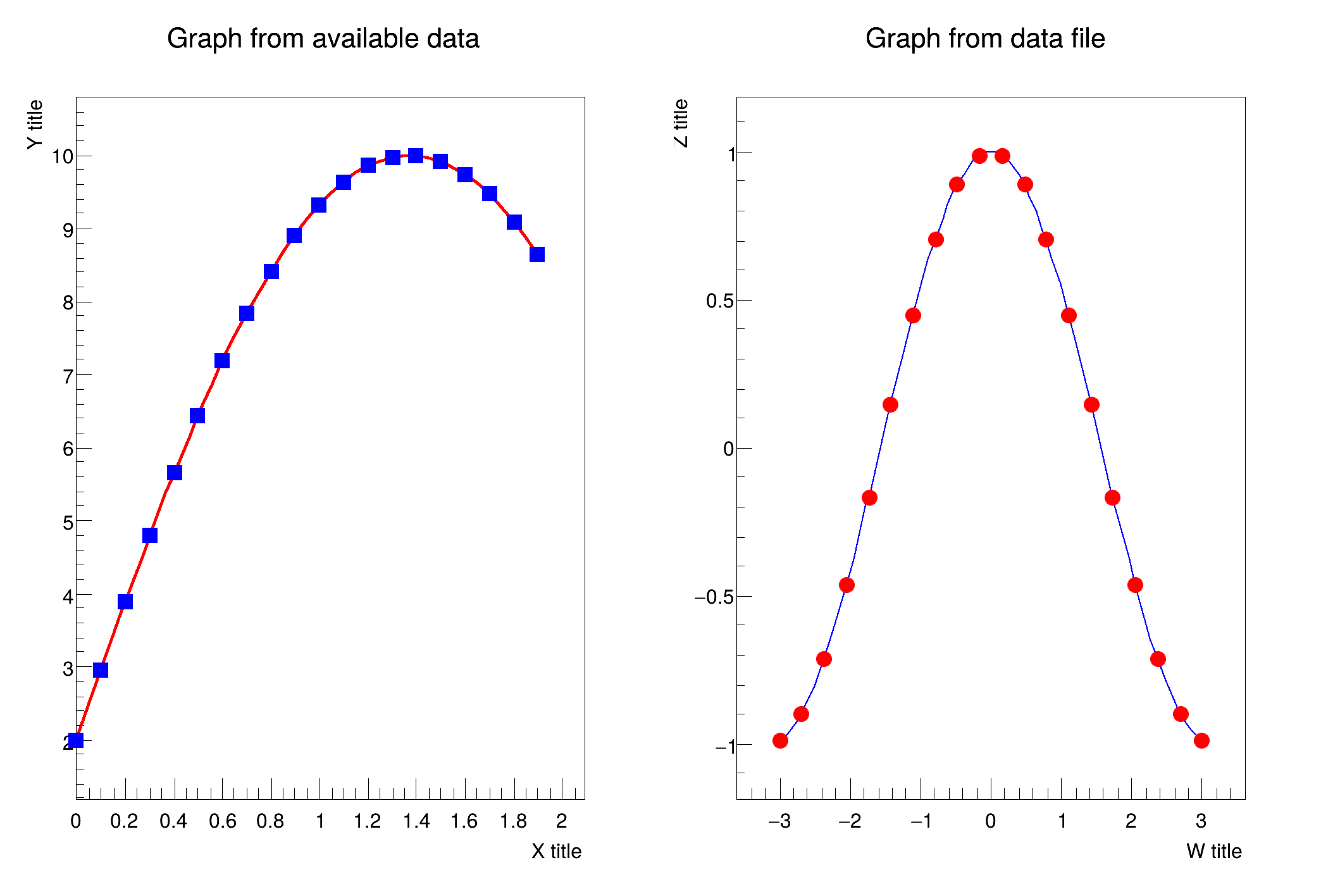 A TGraph is an object made of two arrays X and Y with n points each. ROOT can create TGraphs automatically by reading a text file (e.g. CSV), using a function, another TGraph, histogram, vectors, arrays, or even by adding pairs of points one by one.