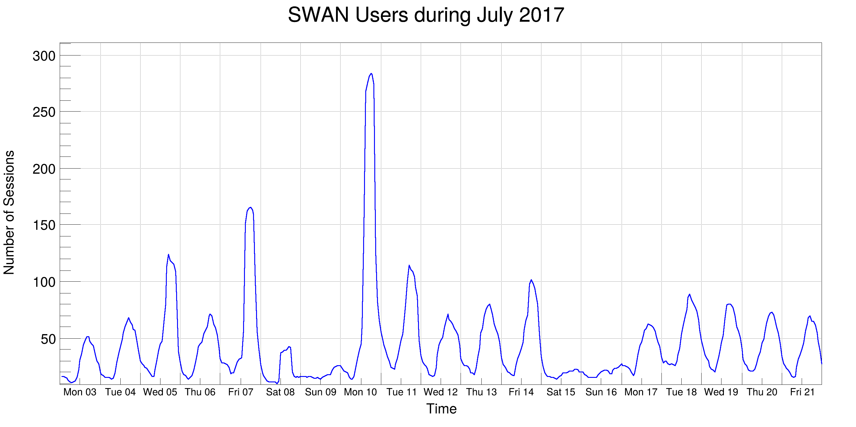 This macro illustrates the use of the time axis on a TGraph with data read from a text file containing the SWAN usage statistics during July 2017. | |