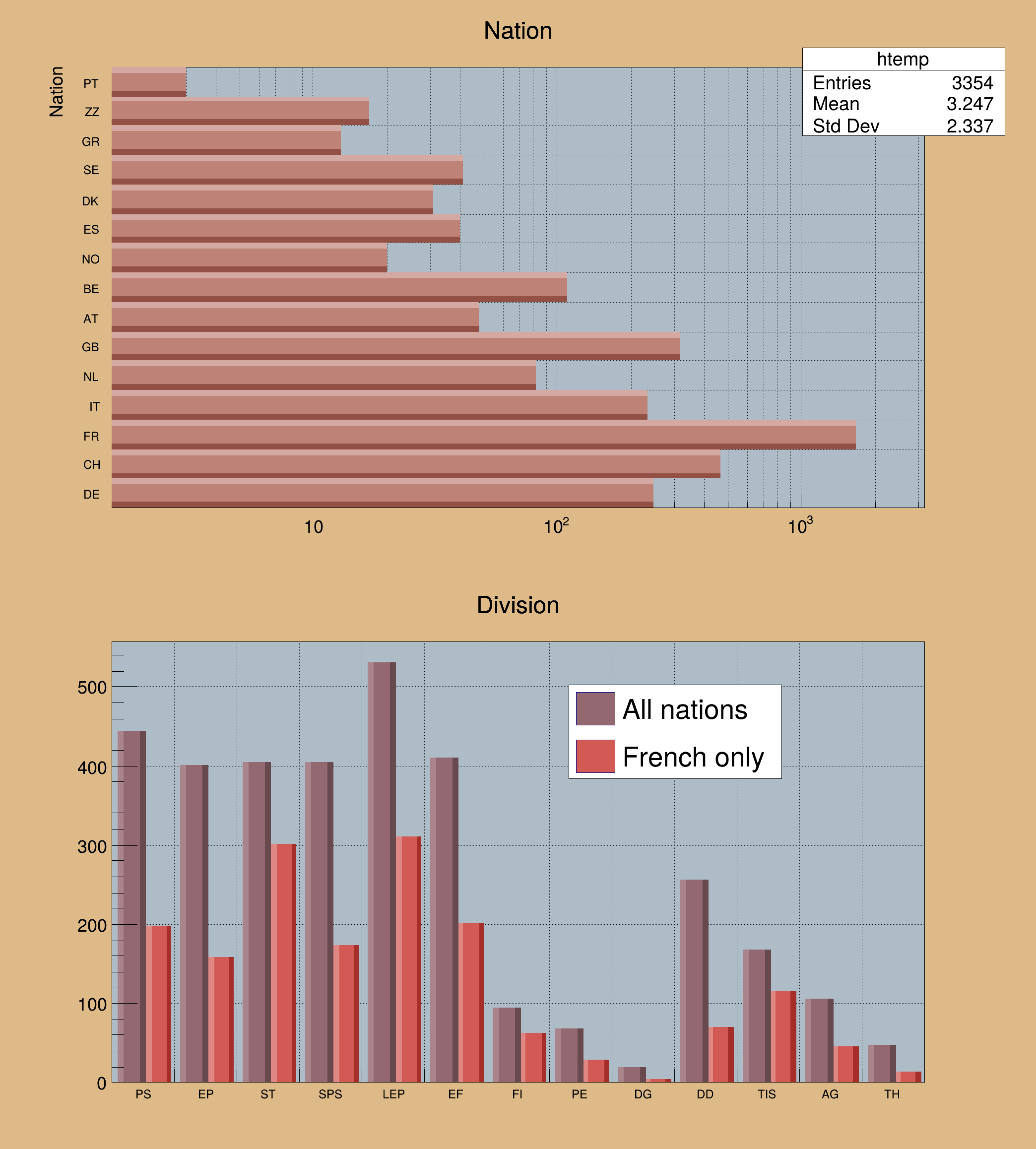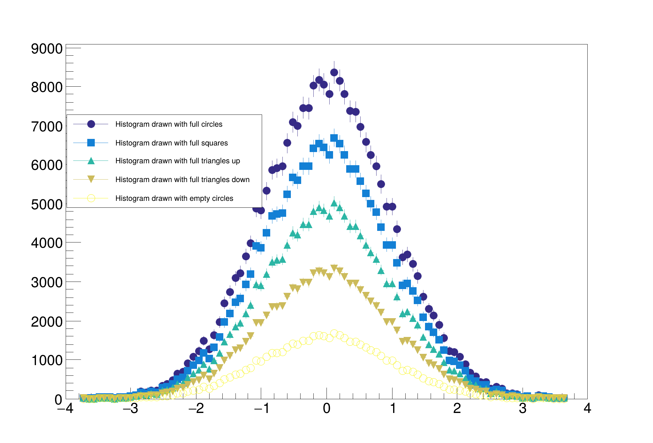 Palette coloring for histograms' stack is activated thanks to the options PFC (Palette Fill Color), PLC (Palette Line Color) and AMC (Palette Marker Color). | |