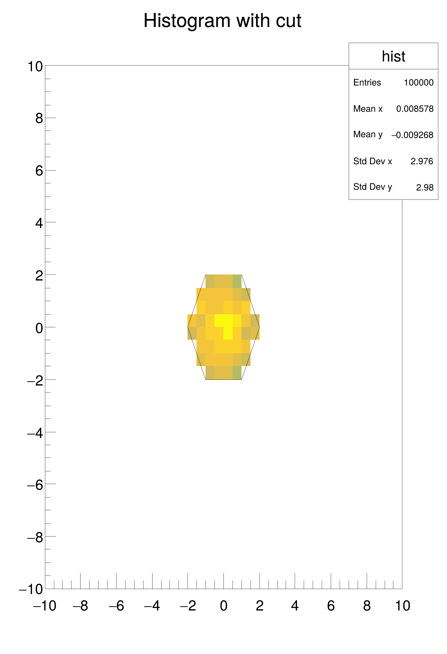 This example demonstrates how to display a 2D histogram and use TCutG object to select bins for drawing. | |