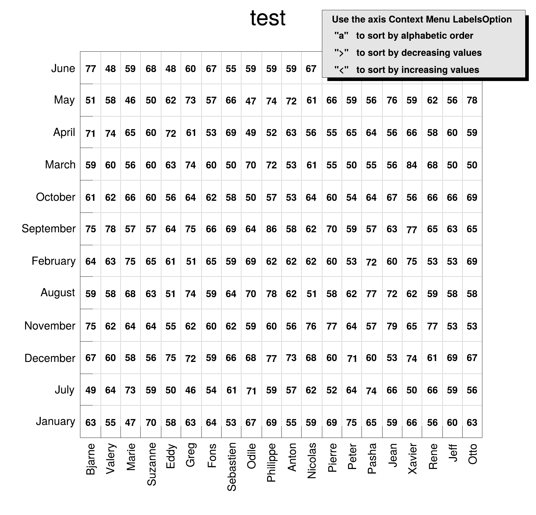 2-D histograms with alphanumeric labels. | |