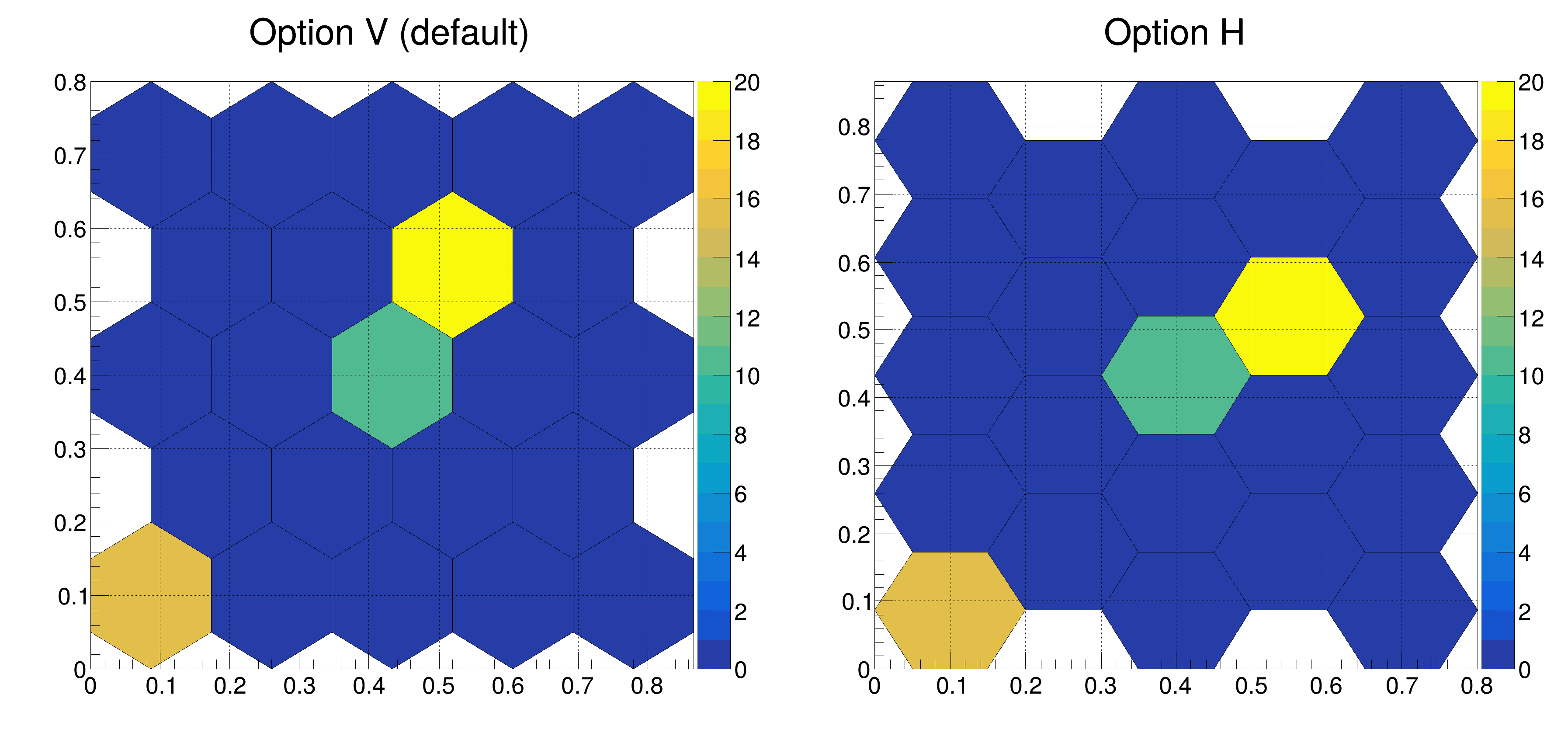 | hist038_TH2Poly_honeycomb.C | Create a histogram with hexagonal bins (TH2Poly). |