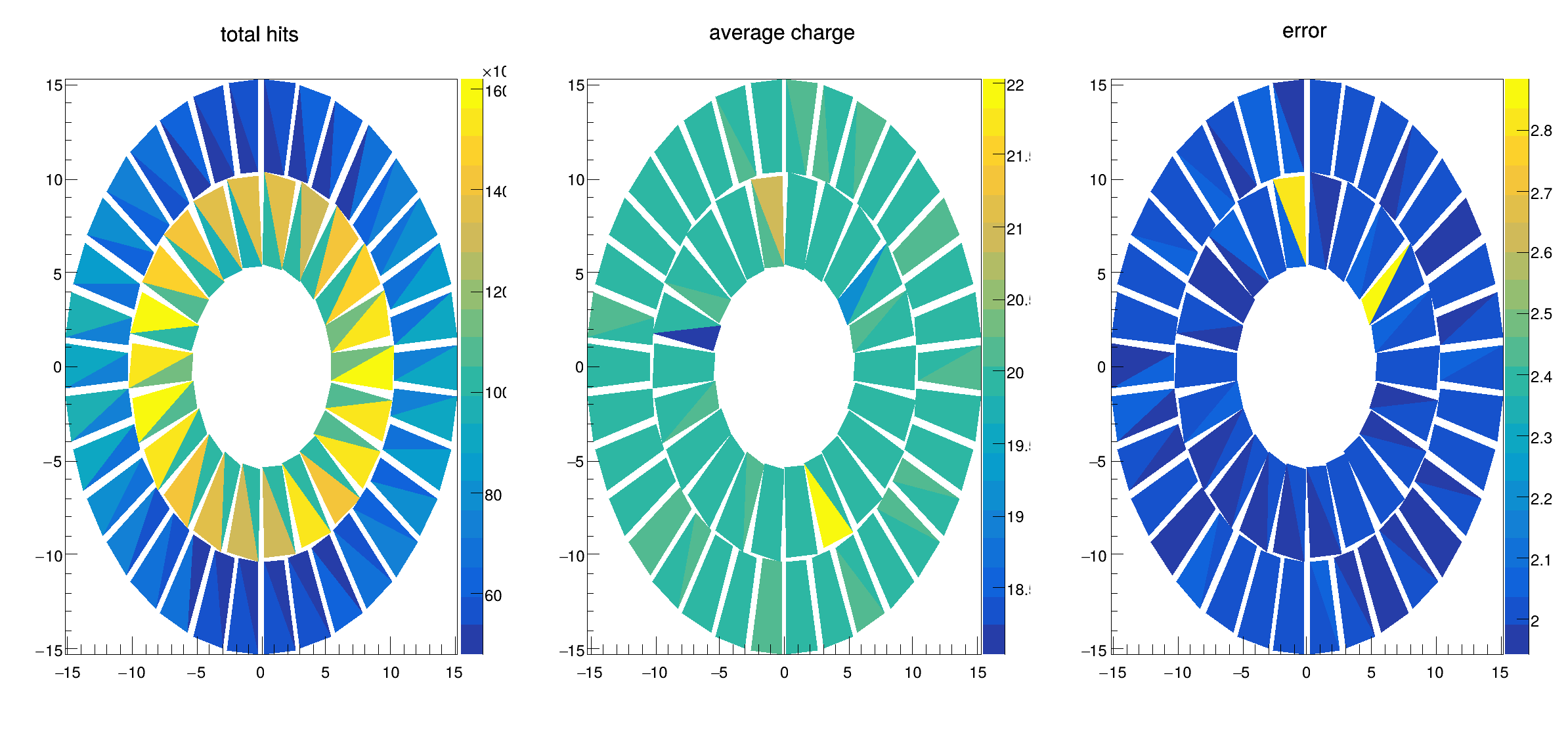 | hist042_TProfile2Poly_module_error.C | Create a histogram with polygonal bins simulating a faulty detector panel w.r.t. particle charge. |