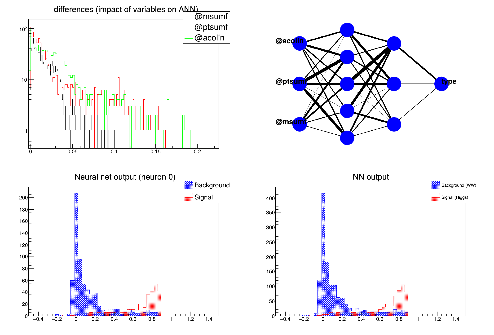 Example of a Multi Layer Perceptron For a LEP search for invisible Higgs boson, a neural network was used to separate the signal from the background passing some selection cuts.