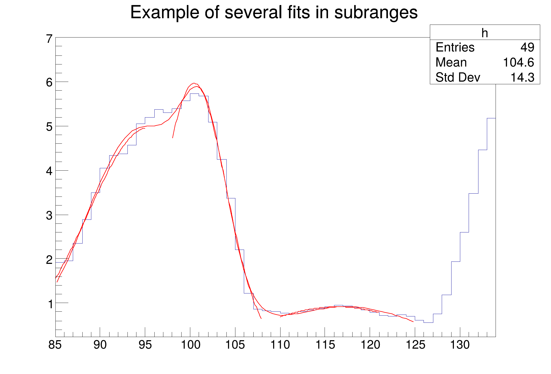 Fitting multiple functions to different ranges of a 1-D histogram Example showing how to fit in a sub-range of an histogram A histogram is created and filled with the bin contents and errors defined in the table below.