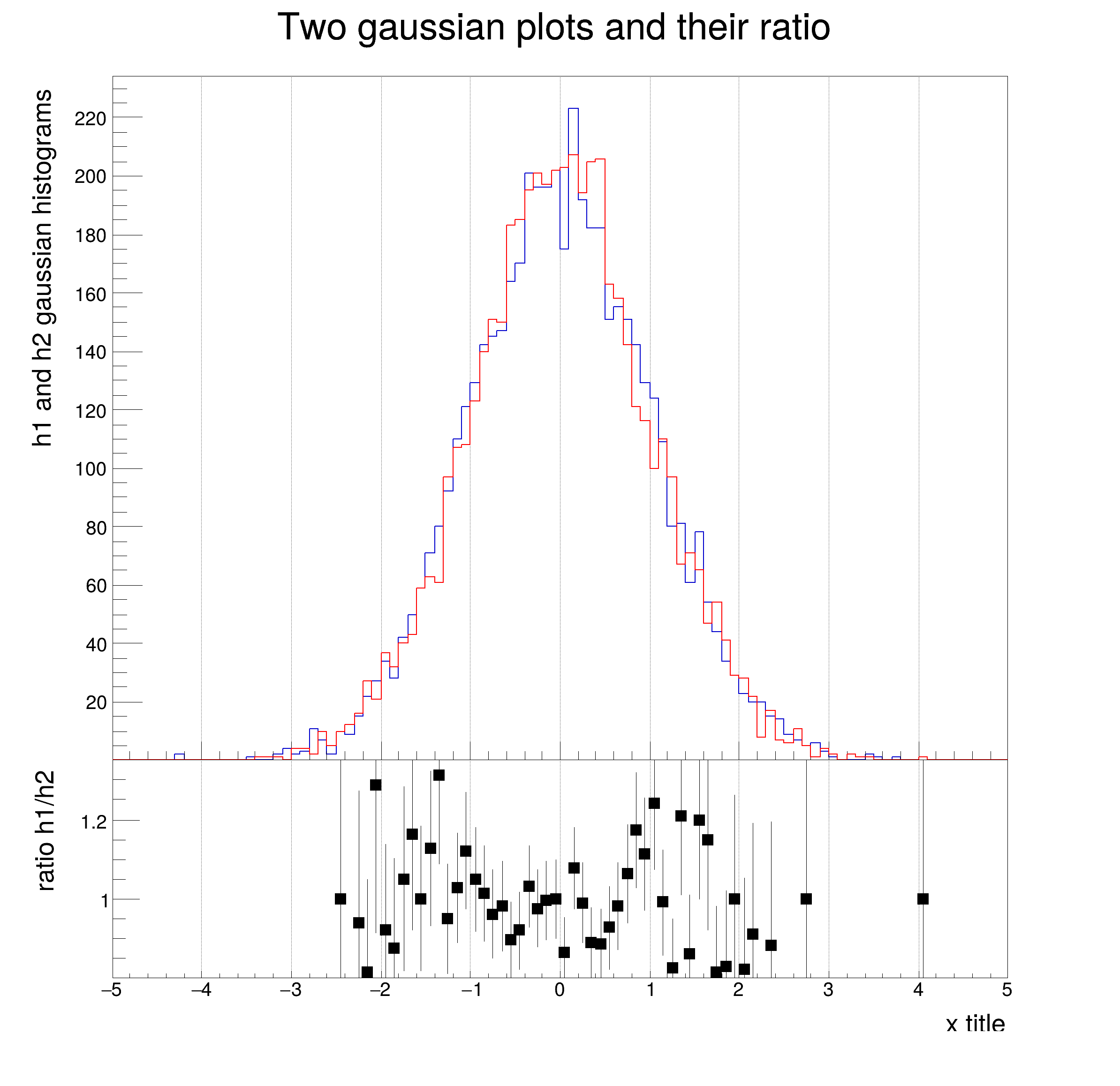 "Two gaussian plots and their ratio;x title; h1 and h2 gaussian histograms", 100, -5, 5);