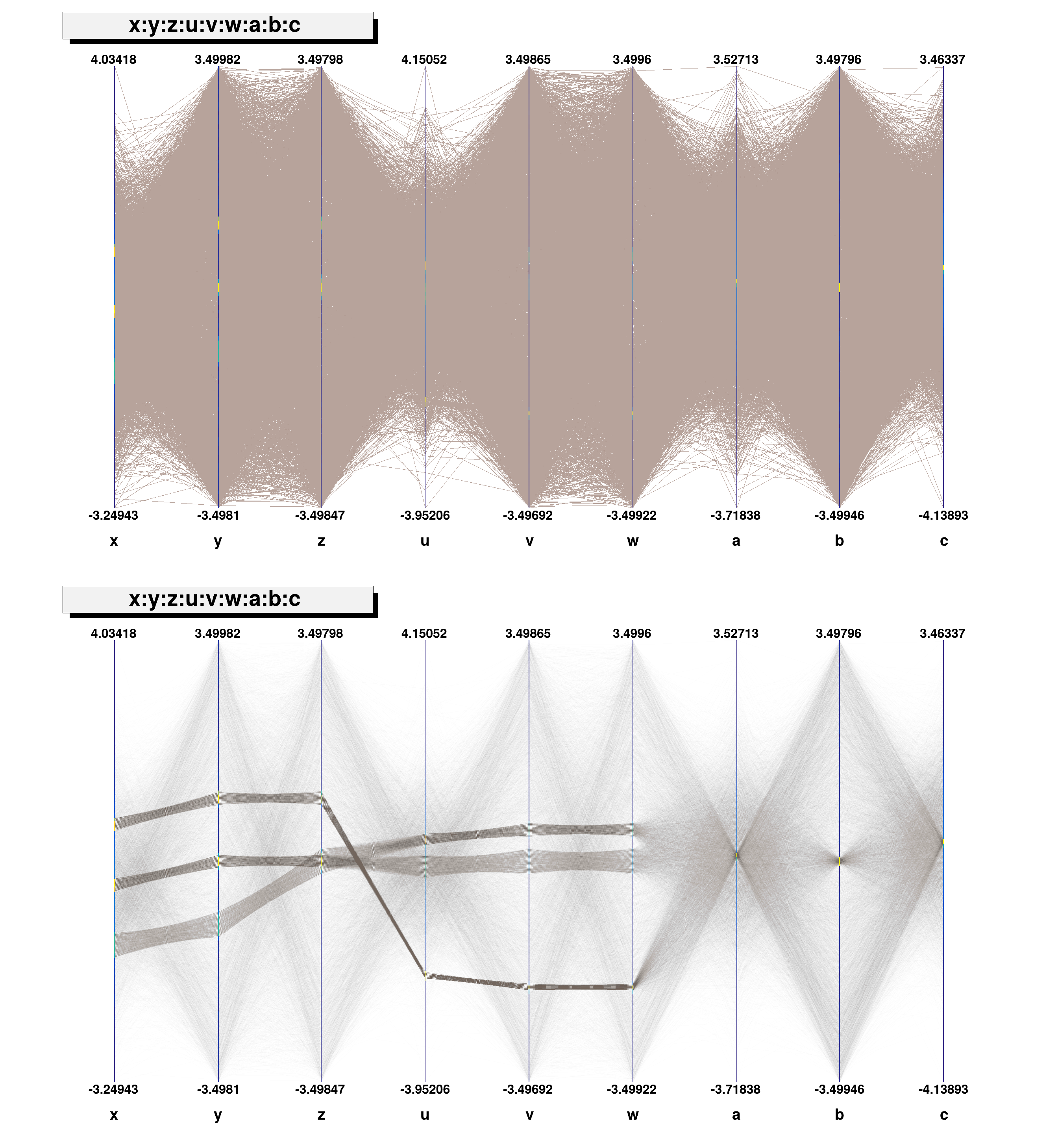 It displays the same data set twice. The first time without transparency and the second time with transparency. On the second plot, several clusters appear.