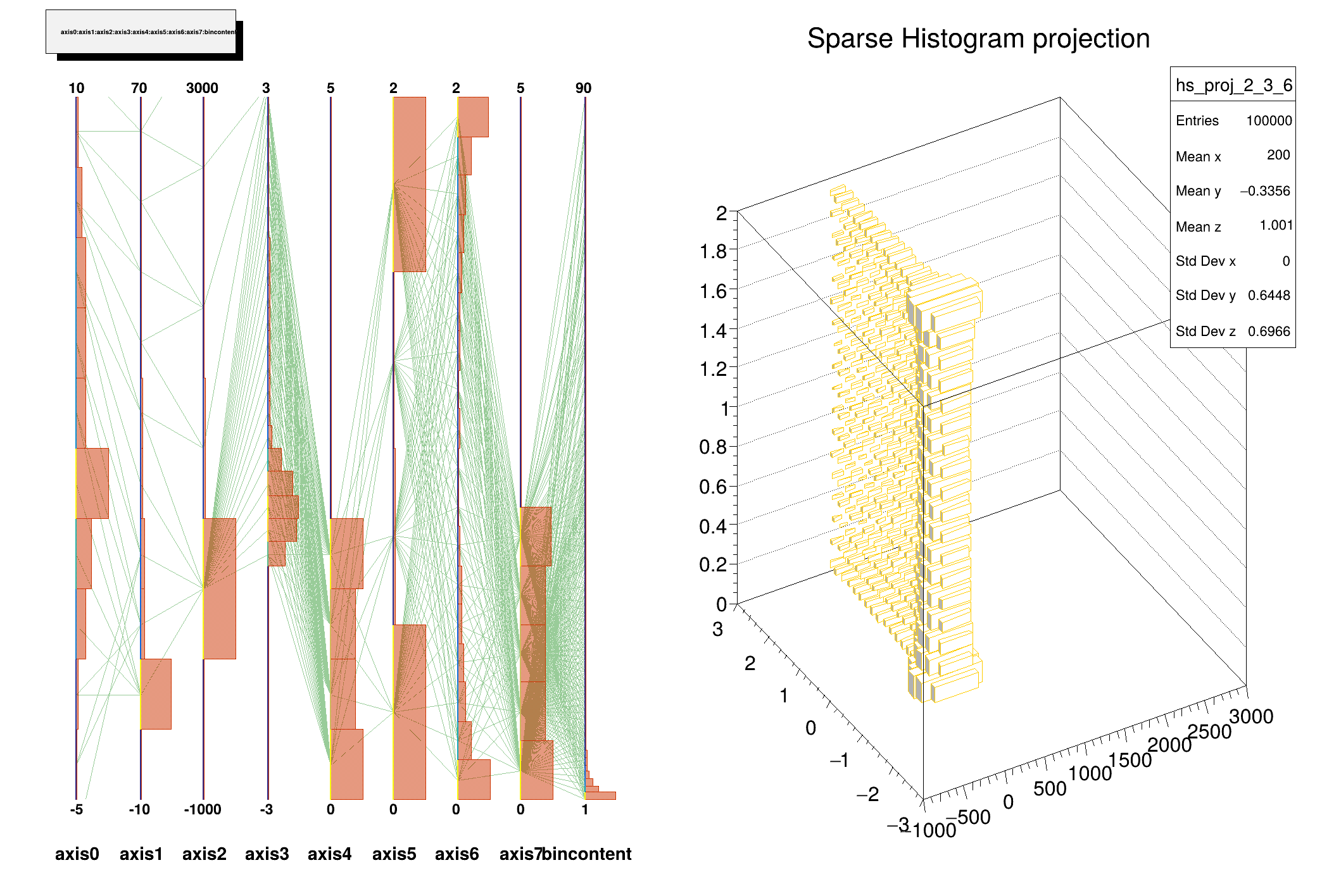 The plot will contain one line for each filled bin, with the bin's coordinates on each axis, and the bin's content on the rightmost axis.
