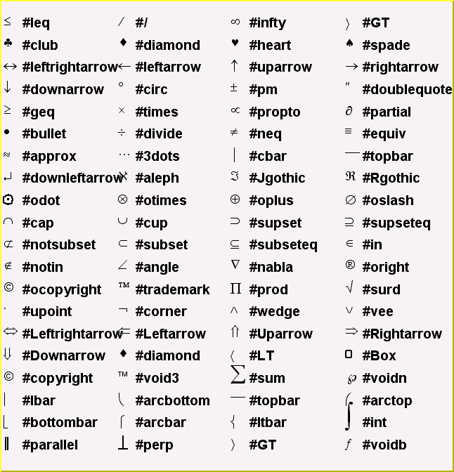 TLatex can make dozens of special mathematical symbols. A few of them, such as
