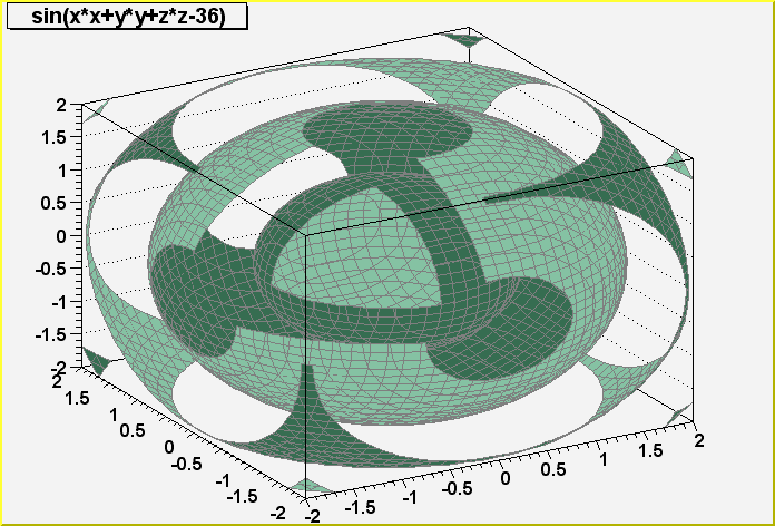 TF3 *fun3 = new TF3("fun3","sin(x*x+y*y+z*z-36)",-2,2,-2,2,-2,2);