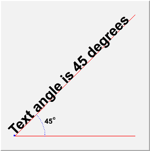 { TCanvas *Ta = new TCanvas("Ta","Text angle",0,0,300,326); Ta->Range(0,0,1,1); TLine *l = new TLine(); l->SetLineColor(kRed); l->DrawLine(0.1,0.1,0.9,0.1); l->DrawLine(0.1,0.1,0.9,0.9); TMarker *m = new TMarker(); m->SetMarkerStyle(20); m->SetMarkerColor(kBlue); m->DrawMarker(0.1,0.1); TArc *a = new TArc(); a->SetFillStyle(0); a->SetLineColor(kBlue); a->SetLineStyle(3); a->DrawArc(0.1, 0.1, 0.2, 0.,45.,"only"); TText *tt = new TText(0.1,0.1,"Text angle is 45 degrees"); tt->SetTextAlign(11); tt->SetTextSize(0.1); tt->SetTextAngle(45); tt->Draw(); TLatex *t1 = new TLatex(0.3,0.18,"45^{o}"); t1->Draw(); return Ta; }