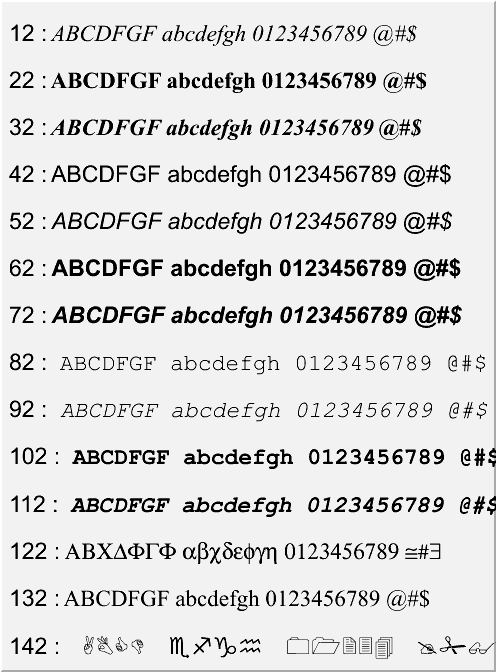 Font number X11 Names Win32/TTF Names 1 : times-medium-i-normal "Times New Roman" 2 : times-bold-r-normal "Times New Roman" 3 : times-bold-i-normal "Times New Roman" 4 : helvetica-medium-r-normal "Arial" 5 : helvetica-medium-o-normal "Arial" 6 : helvetica-bold-r-normal "Arial" 7 : helvetica-bold-o-normal "Arial" 8 : courier-medium-r-normal "Courier New" 9 : courier-medium-o-normal "Courier New" 10 : courier-bold-r-normal "Courier New" 11 : courier-bold-o-normal "Courier New" 12 : symbol-medium-r-normal "Symbol" 13 : times-medium-r-normal "Times New Roman" 14 : "Wingdings"The following picture shows how each font looks like. The number on the left is the "Text font code". In this picture precision 2 was selected.