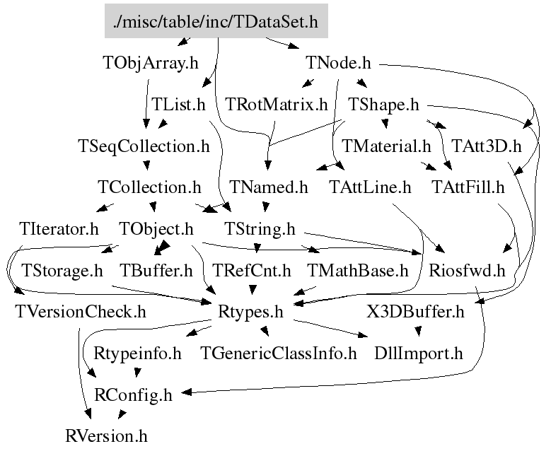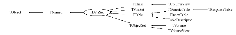 TDataSet TDataSet class is to create a special compound object-container: TDataSet object ::= the "named" list of TDataSet objects where the "list" (the pointer to TList object) may contain no object TDataSet object has a back pointer to its "parent" TDataSet object, the "character" *name* and "character" *title* The service this class does provide is to help the user to build and manage the hierarchy of his/her data but the data itself. So it is not "Container" itself rather the basement (base class) to built the containers. One may derive the custom container classes from TDataSet. See for example TObjectSet, TTable, TVolume, TFileSet These classes derived from TDataSet: Class Name TObjectSet::public TDataSet - is a container for TObject TTable:: public TDataSet - is a container for the array of any "plain" C-structure TNode:: public TDataSet - is a container for 3D objects TMaker:: public TDataSet - is a container for STAR "control" objects etc etc TDataSet class is a base class to implement the directory-like data structures and maintain it via TDataSetIter class iterator TDataSet can be iterated using an iterator object (see TDataSetIter) or by TDataSet::Pass method (see below) Terms: Dataset - any object from the list above ===== Member is called "DataSet Member" Structural - the "Dataset Member" is its member "Structural member" if its "back pointer" points to this object Dataset - we will say this TDataSet object "OWNs" Owner (or is an OWNER / PARENT of ) another (parent) TDataSet object if the last one is its "Structural Member" Associated - If some object is not "Structural member" member of this object we will say it is an "Associated Member" of this dataset Orphan - If some dataset is a member of NO other dataset TDataSet object it is called an "orphan" dataset object - Any TDataSet object may be "Owned" by one and only one another TDataSet object if any. - Any TDataSet object can be the "Structural Member" of one and only one another TDataSet - Any TDataSet object may be an "Associated Member" for any number of other TDataSet objects if any - NAME issue: Each "dataset member" is in possession of some "alpha-numerical" NAME as defined by TNamed class. The NAME may contain any "printable" symbols but "SLASH" - "/" The symbol "RIGHT SLASH" - "/" can not be used as any part of the "DataSet Member" NAME Any DataSet can be found by its NAME with TDataSetIter object - TITLE issue: Each "dataset member" is in possession of the "alpha-numerical" TITLE as defined by TNamed class. The meaning of the TITLE is reserved for the derived classes to hold there some indetification that is special for that derived class. This means the user must be careful about the "TDataSet // NAME and TITLE since this may cause some "side effects" of the particular class functions - It is NOT required those all "DataSet Members" are in possession of the unique names, i.e. any number of "DataSet Members" may bear one and the same name Actions: Create DataSet is born either as "Orphan" or as "Structural Member" of another TDataSet object Add One dataset can be included into another dataset. Upon adding: - the "Orphan dataset" becomes "Structural Member" - "Structural Members" of another dataset becomes the "Associated Member" of this datatset Delete - Upon deleting the "Structural Member": - "REMOVES" itself from the "Parent DataSet". - Its "Associated memberships" is not changed though The last means the DataSet with the "Associated Members" may contain a DIED pointers to unexisting "Associated" objects !!! Further information is provided my the particular method descriptions. The TDataSet class has several methods to control object('s) memberships