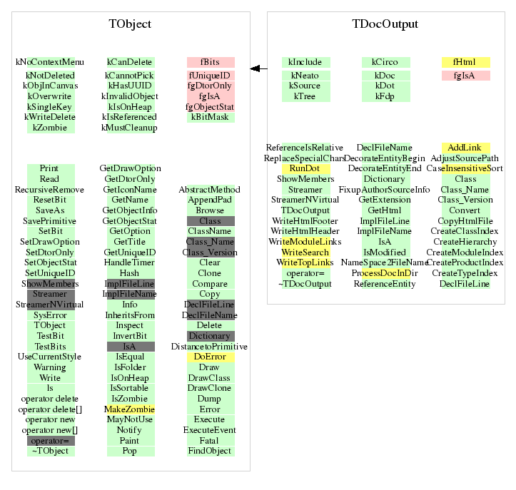 THtml generated documentation is written to file by TDocOutput. So far only output of HTML is implemented. Customization of the output should be done with THtml's interfaces - TDocOutput should not be used nor re-implemented directly. TDocOutput generates the index tables: * classes (THtml invokes TClassDocOutput for each), * inheritance hierarchy, * types and typedefs, * libraries, * the product index, and * the module index (including the links to per-module documentation). It invokes AT&T's GraphViz tool (dot) if available; charts benefit a lot from it. TDocOutput also writes all pages' header and footer, which can be customized by calling THtml::SetHeader(), THtml::SetFooter().