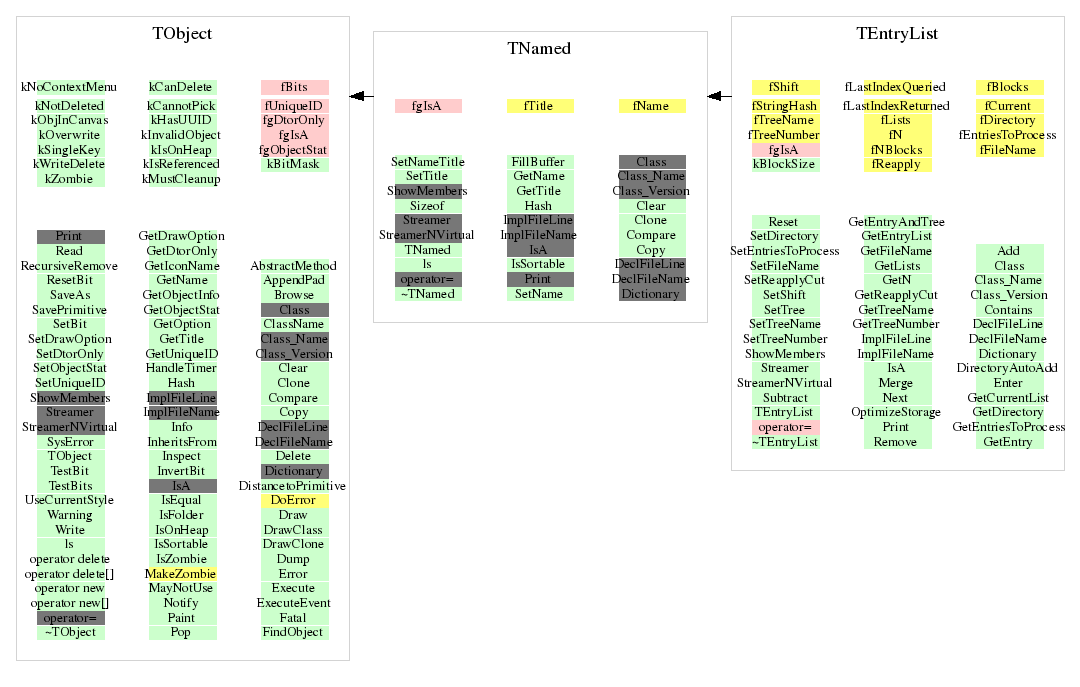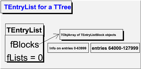 1. for a TTree (fBlocks data member is non-zero) Entry numbers are stored in TEntryListBlocks, which, in their turn, are stored in the TObjArray fBlocks. The range of the entry numbers is cut into intervals of kBlockSize entries (currently 64000), so that the first block contains information which entries out of the first 64000 pass the selection, the second block - which entries out of the 64000-127999 interval pass the selection, etc. Some blocks, obviously, might be empty. The internal representation of entry numbers in the blocks is described in the TEntryListBlock class description, and this representation might be changed by calling OptimizeStorage() function (when the list is filled via the Enter() function, this is done automatically, except for the last block). Individual entry lists can be merged (functions Merge() and Add()) to make an entry list for a TChain of corresponding TTrees.