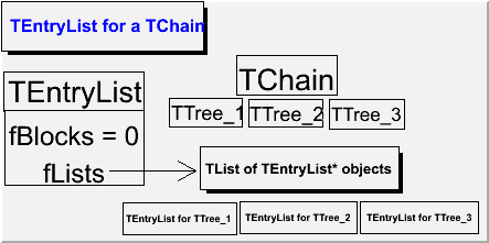 2. for a TChain (fLists data member is non-zero) It contains a TList of sub-lists (TEntryList objects, corresponding to each TTree) Trees and lists are matched by the TTree name and its file name (full path). All sub-lists are returned by the GetLists() function and individual lists are returned by GetEntryList() function. Such lists are no different from the lists for TTrees, described above.