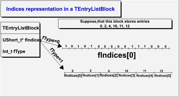 In both cases, a UShort_t* is used. The second option is better in case less than 1/16 or more than 15/16 of entries pass the selection, and the representation can be changed by calling OptimizeStorage() function. When the block is being filled, it's always stored as bits, and the OptimizeStorage() function is called by TEntryList when it starts filling the next block. If Enter() or Remove() is called after OptimizeStorage(), representation is again changed to 1).