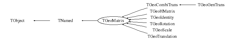 The base class TGeoMatrix defines abstract metods for: - translation, rotation and scale getters. Every derived class stores only its specific data, e.g. a translation stores an array of 3 doubles and a rotation an array of 9. However, asking which is the rotation array of a TGeoTranslation through the base TGeoMatrix interface is a legal operation. The answer in this case is a pointer to a global constant array representing an identity rotation. Double_t *TGeoMatrix::GetTranslation() Double_t *TGeoMatrix::GetRotation() Double_t *TGeoMatrix::GetScale() - MasterToLocal() and LocalToMaster() point and vector transformations : void TGeoMatrix::MasterToLocal(const Double_t *master, Double_t *local) void TGeoMatrix::LocalToMaster(const Double_t *local, Double_t *master) void TGeoMatrix::MasterToLocalVect(const Double_t *master, Double_t *local) void TGeoMatrix::LocalToMasterVect(const Double_t *local, Double_t *master) These allow correct conversion also for reflections. - Transformation type getters : Bool_t TGeoMatrix::IsIdentity() Bool_t TGeoMatrix::IsTranslation() Bool_t TGeoMatrix::IsRotation() Bool_t TGeoMatrix::IsScale() Bool_t TGeoMatrix::IsCombi() (translation + rotation) Bool_t TGeoMatrix::IsGeneral() (translation + rotation + scale) Combinations of basic transformations are represented by specific classes deriving from TGeoMatrix. In order to define a matrix as a combination of several others, a special class TGeoHMatrix is provided. Here is an example of matrix creation : Matrix creation example: root[0] TGeoRotation r1,r2; r1.SetAngles(90,0,30); // rotation defined by Euler angles r2.SetAngles(90,90,90,180,0,0); // rotation defined by GEANT3 angles TGeoTranslation t1(-10,10,0); TGeoTranslation t2(10,-10,5); TGeoCombiTrans c1(t1,r1); TGeoCombiTrans c2(t2,r2); TGeoHMatrix h = c1 * c2; // composition is done via TGeoHMatrix class root[7] TGeoHMatrix *ph = new TGeoHMatrix(hm); // this is the one we want to // use for positioning a volume root[8] ph->Print(); pVolume->AddNode(pVolDaughter,id,ph) // now ph is owned by the manager Rule for matrix creation: - unless explicitly used for positioning nodes (TGeoVolume::AddNode()) all matrices deletion have to be managed by users. Matrices passed to geometry have to be created by using new() operator and their deletion is done by TGeoManager class. Available geometrical transformations 1. TGeoTranslation - represent a (dx,dy,dz) translation. Data members: Double_t fTranslation[3]. Translations can be added/subtracted. TGeoTranslation t1; t1->SetTranslation(-5,10,4); TGeoTranslation *t2 = new TGeoTranslation(4,3,10); t2->Subtract(&t1); 2. Rotations - represent a pure rotation. Data members: Double_t fRotationMatrix[3*3]. Rotations can be defined either by Euler angles, either, by GEANT3 angles : TGeoRotation *r1 = new TGeoRotation(); r1->SetAngles(phi, theta, psi); // all angles in degrees This represent the composition of : first a rotation about Z axis with angle phi, then a rotation with theta about the rotated X axis, and finally a rotation with psi about the new Z axis. r1->SetAngles(th1,phi1, th2,phi2, th3,phi3) This is a rotation defined in GEANT3 style. Theta and phi are the spherical angles of each axis of the rotated coordinate system with respect to the initial one. This construction allows definition of malformed rotations, e.g. not orthogonal. A check is performed and an error message is issued in this case. Specific utilities : determinant, inverse. 3. Scale transformations - represent a scale shrinking/enlargement. Data members :Double_t fScale[3]. Not fully implemented yet. 4. Combined transformations - represent a rotation folowed by a translation. Data members: Double_t fTranslation[3], TGeoRotation *fRotation. TGeoRotation *rot = new TGeoRotation("rot",10,20,30); TGeoTranslation trans; TGeoCombiTrans *c1 = new TGeoCombiTrans(trans, rot); TGeoCombiTrans *c2 = new TGeoCombiTrans("somename",10,20,30,rot) 5. TGeoGenTrans - combined transformations including a scale. Not implemented. 6. TGeoIdentity - a generic singleton matrix representing a identity transformation NOTE: identified by the global variable gGeoIdentity.